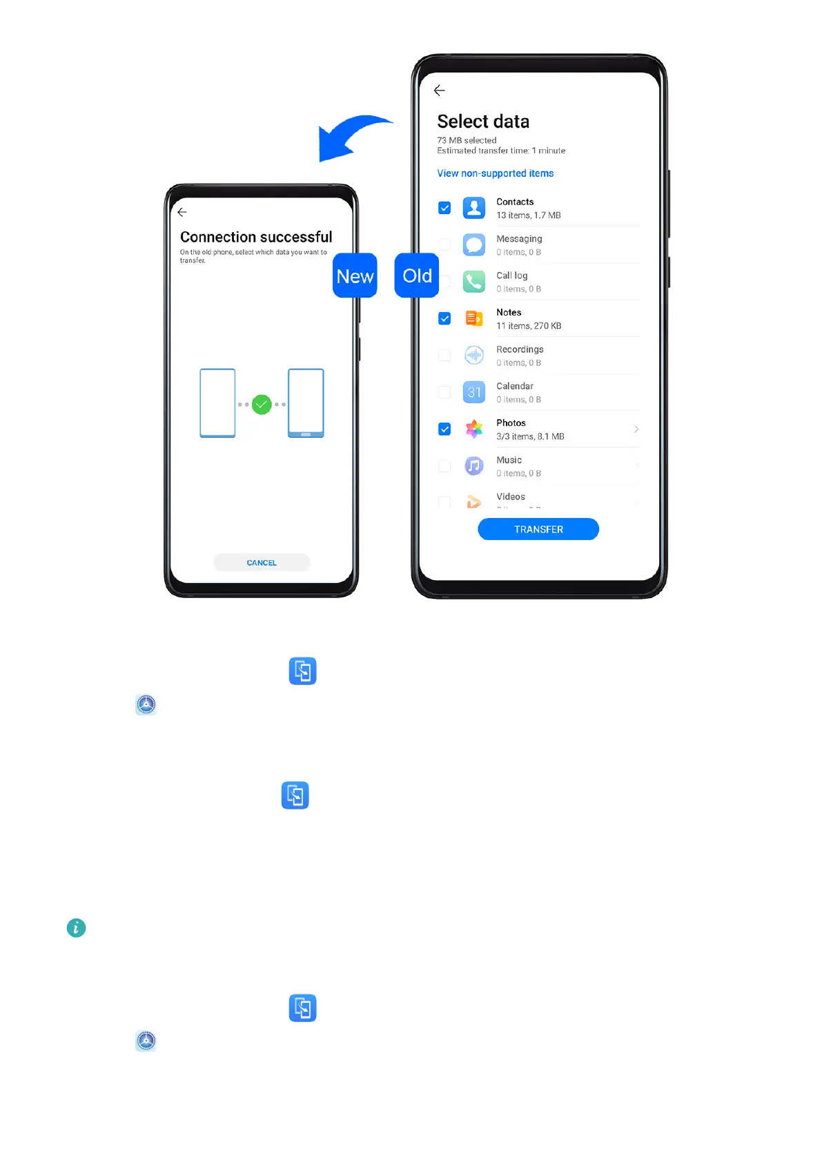 4 On your old device, select the data you want to clone, then touch Transfer to start