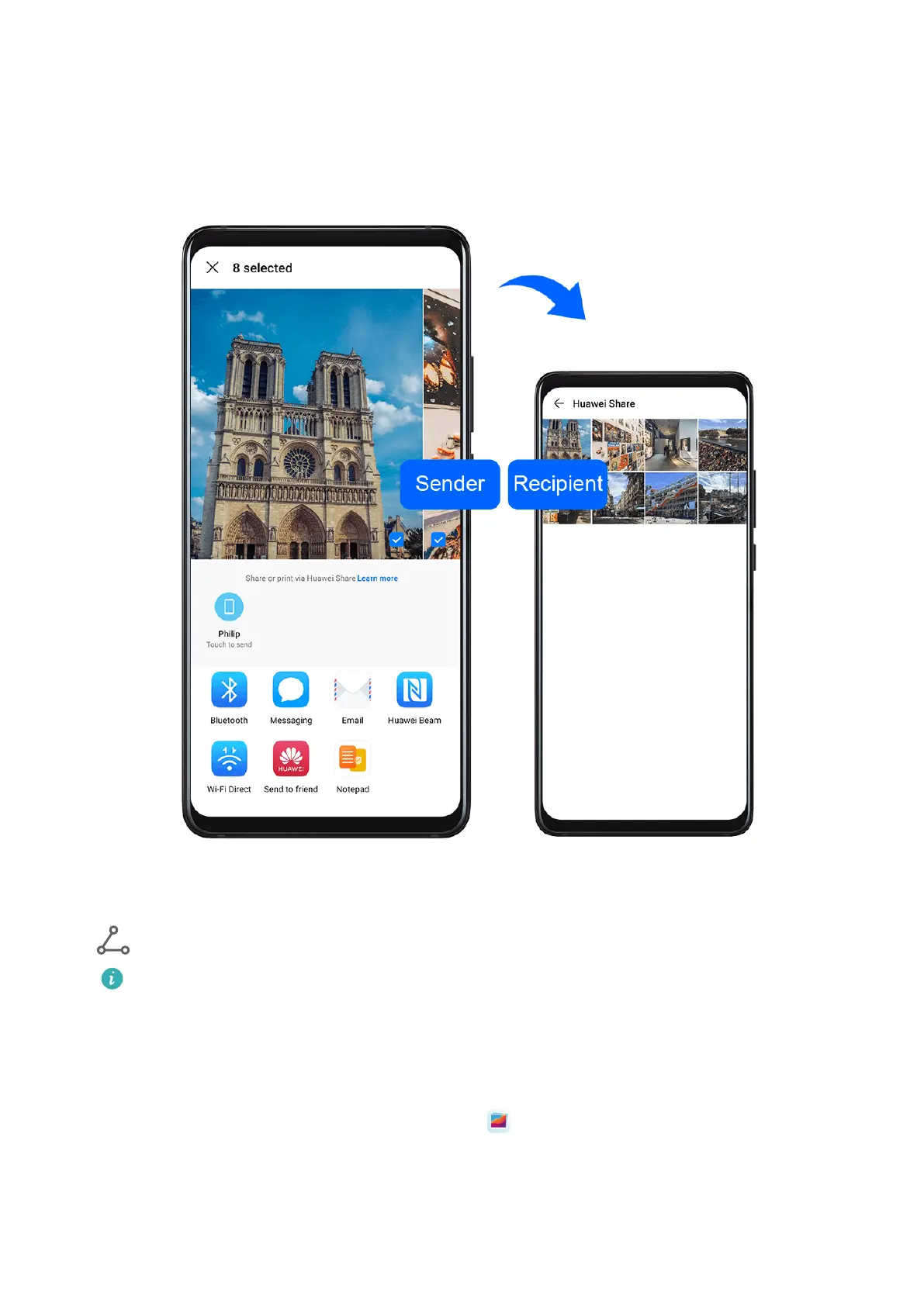 . Touch Huawei Share, then touch the icon of the recipient device to send the le.