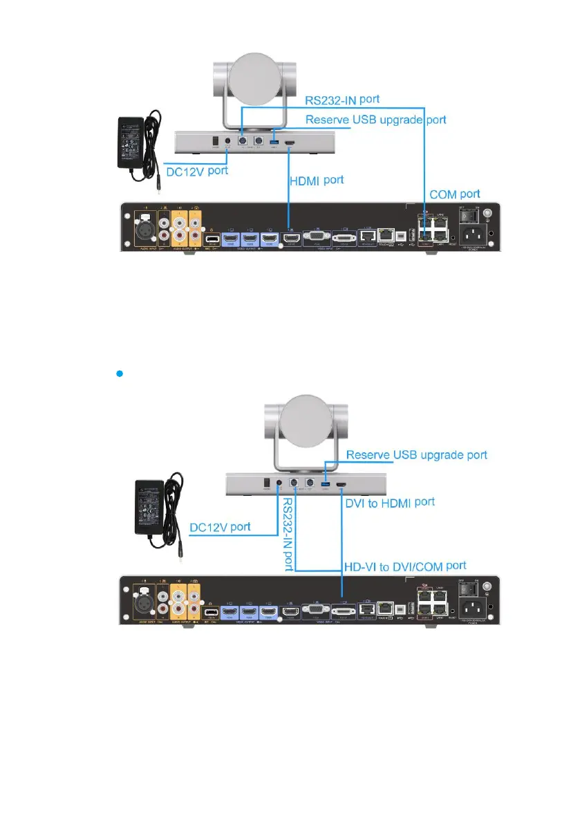 camera's HDMI port, and the Box 500's COM1 to the camera's RS232-IN port.