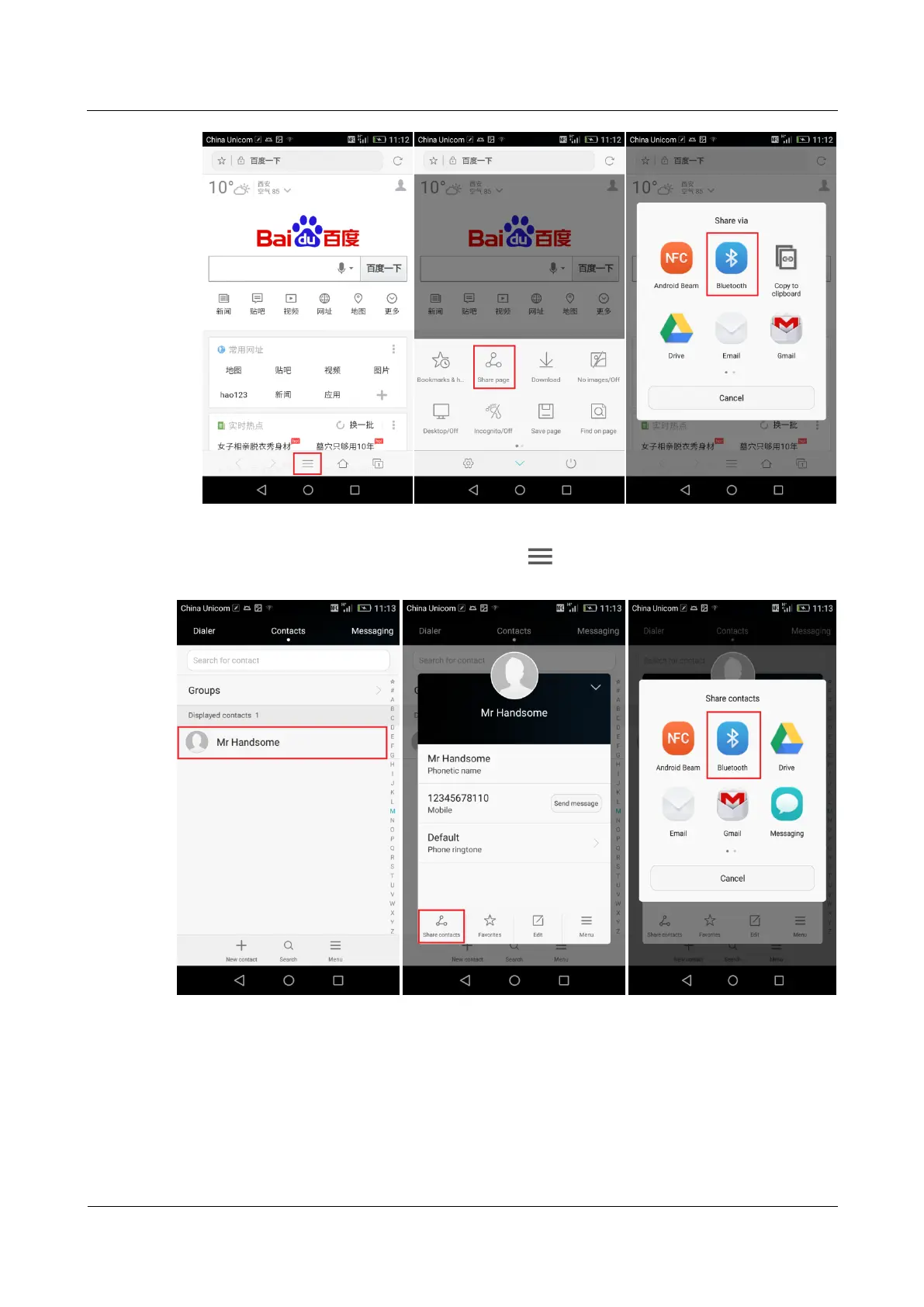 To share a contact, go to Contacts, and touch . From the displayed option menu, choose