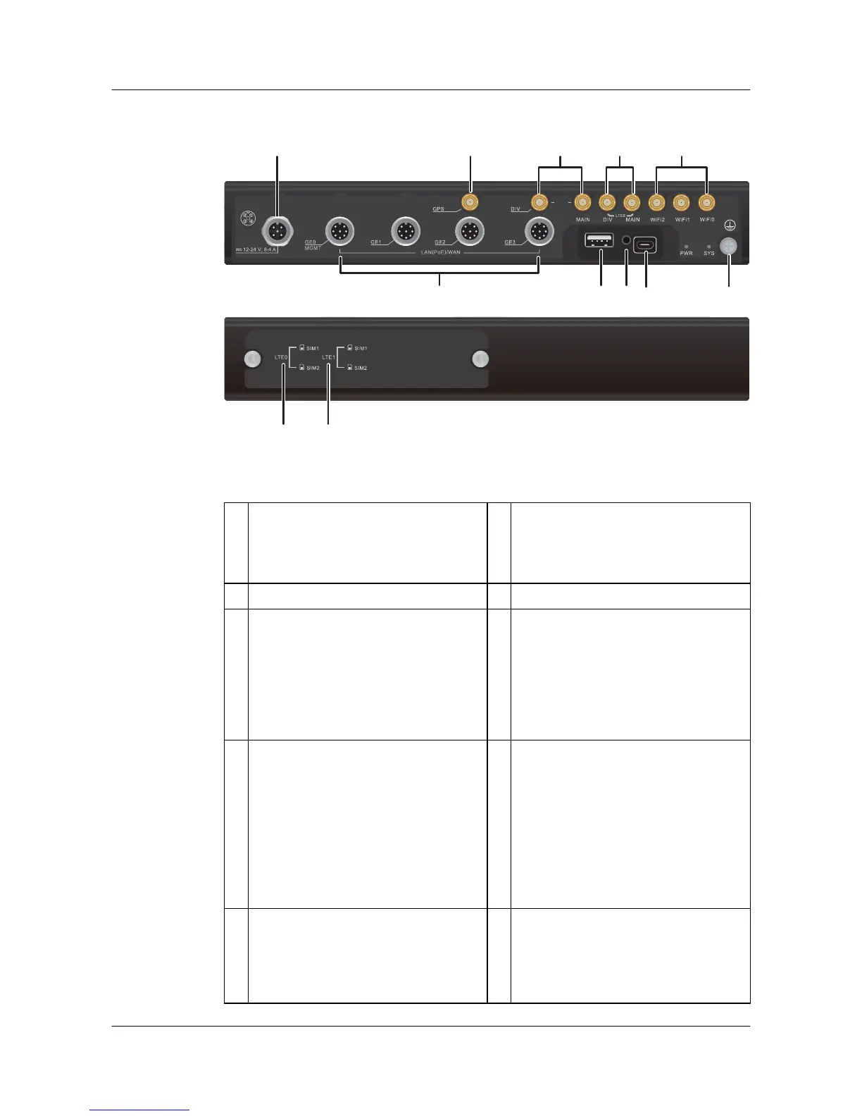 5 Three Wi-Fi antenna interfaces 6 LAN interfaces: four GE electrical
