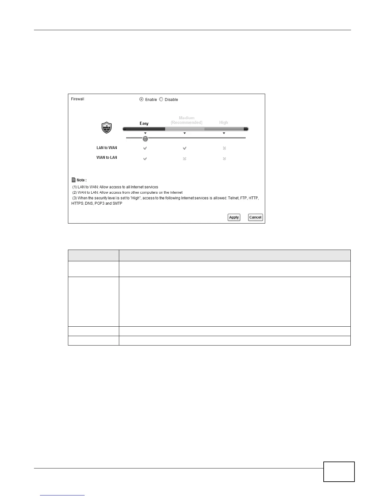 Select High to have the firewall only allow Telnet, FTP, HTTP, HTTPS, DNS, POP3, and