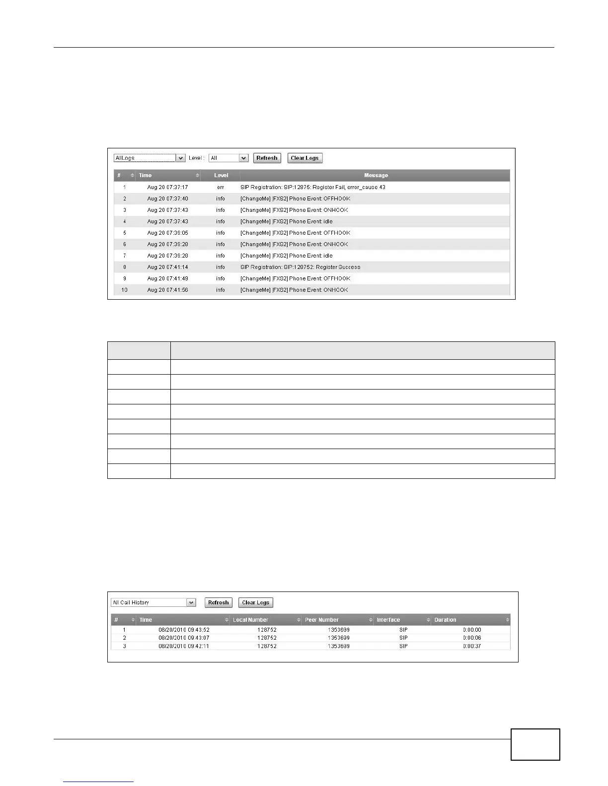 Table 60 System Monitor > Log > Phone Log