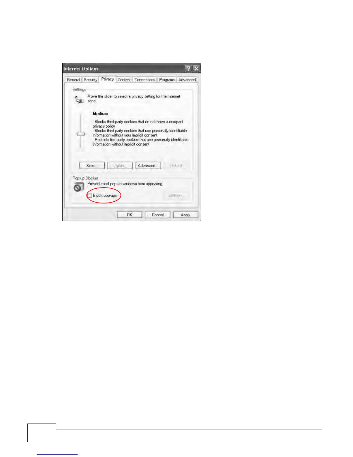 2 Clear the Block pop-ups check box in the Pop-up Blocker section of the screen. This disables any