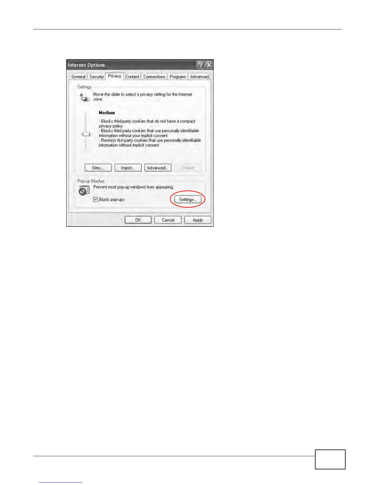 2 Select Settings…to open the Pop-up Blocker Settings screen.