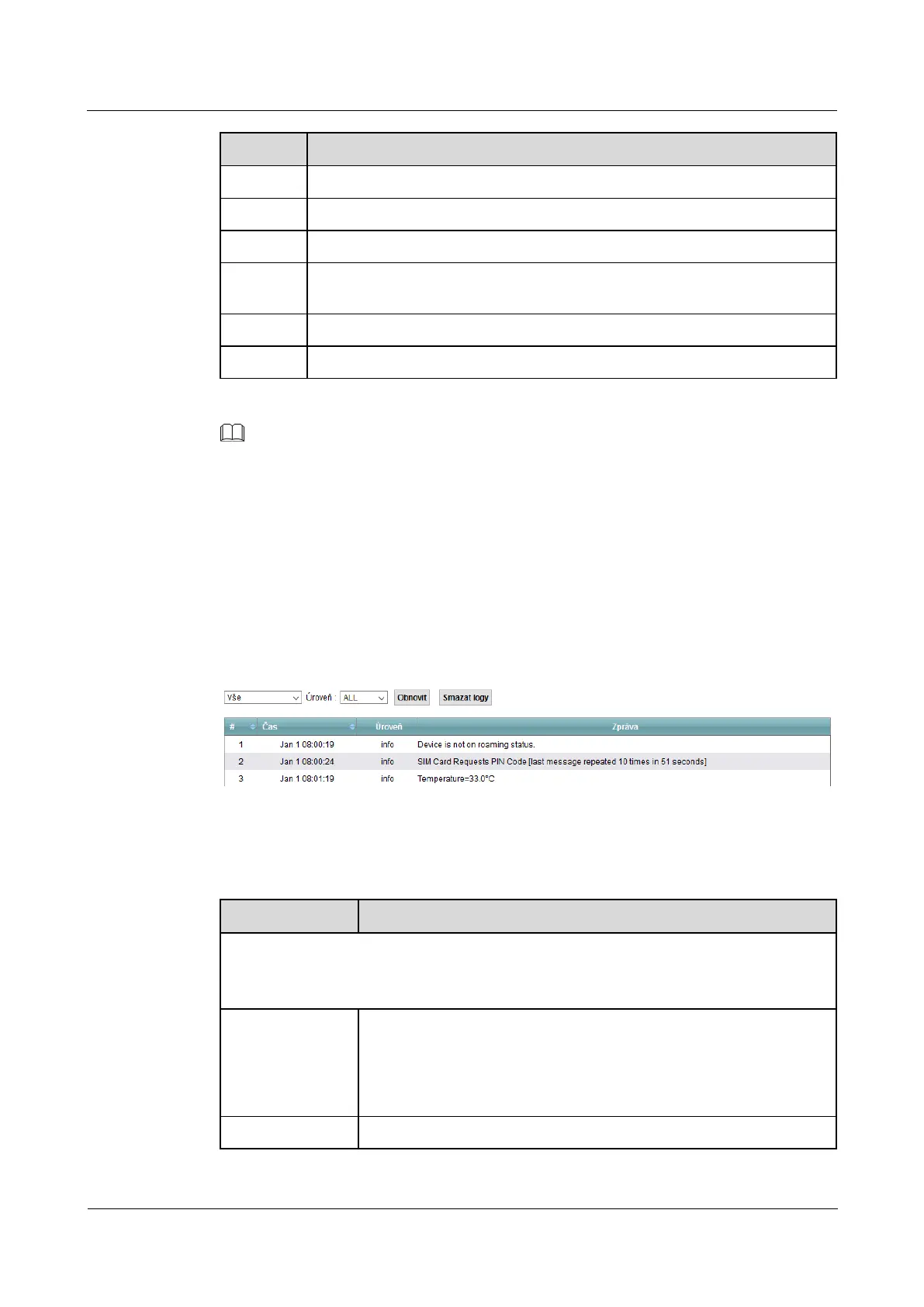 The LTE modem supports system log records with severity levels ERROR, INFO, and DEBUG.