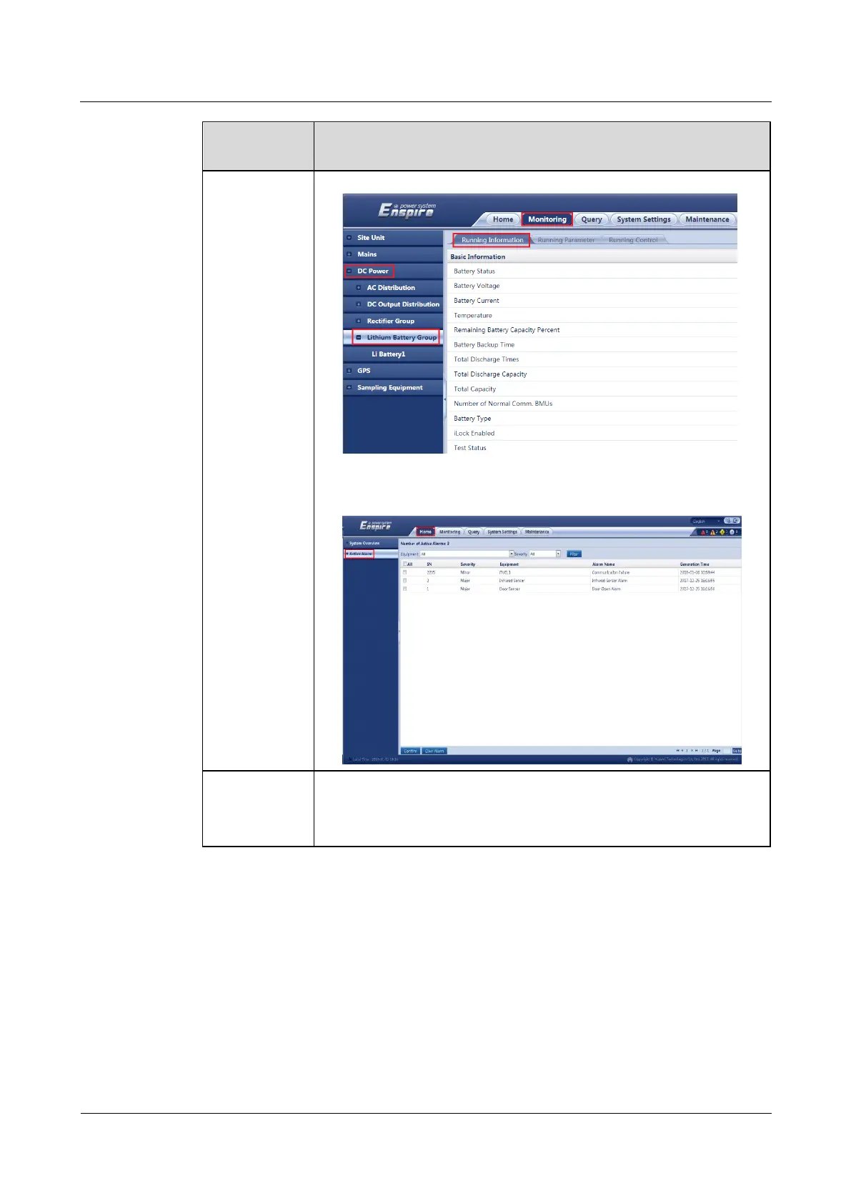 NetEco menu path: Monitor > Site Name > Lithium Battery