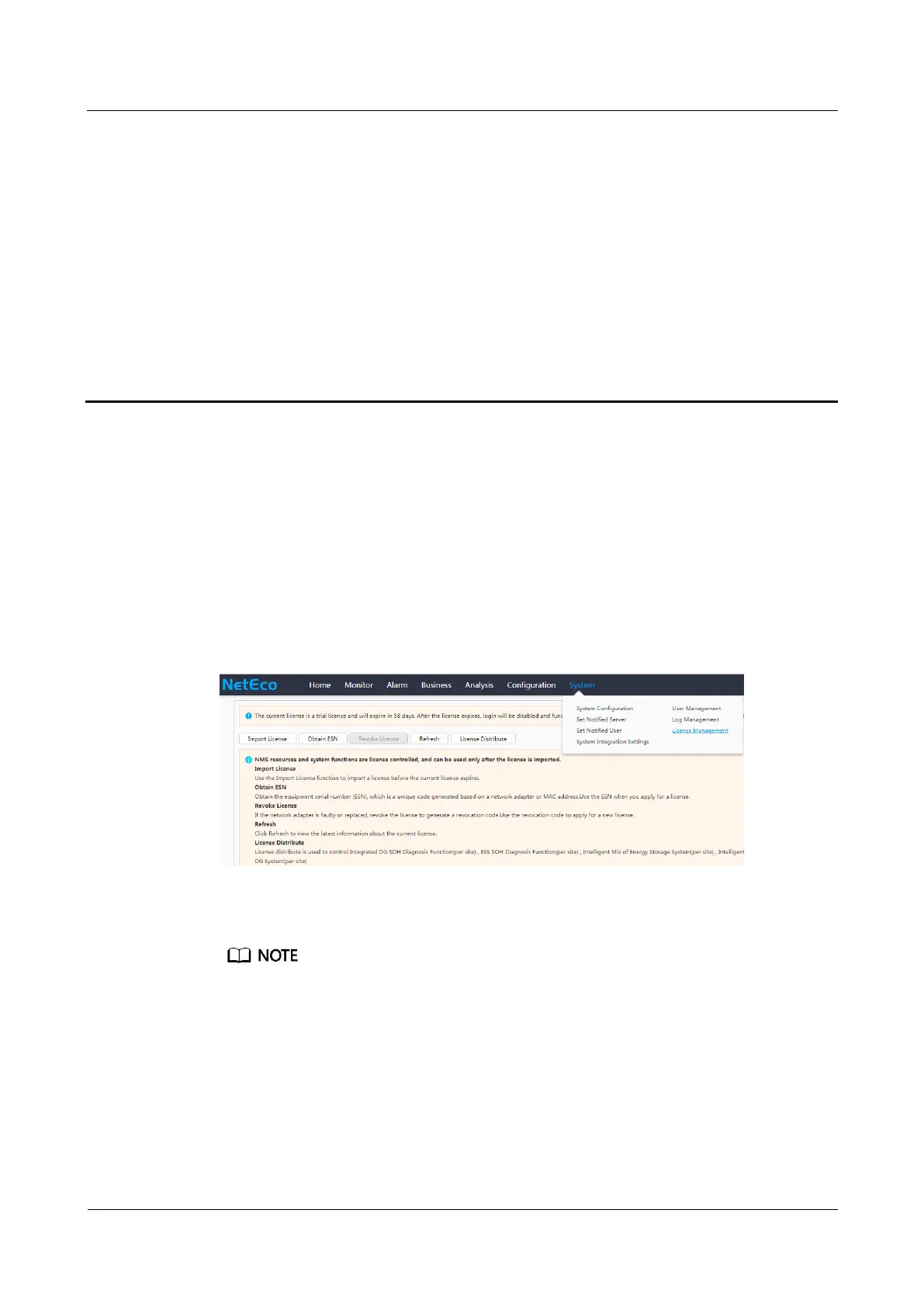 Step 1 Log in to the NetEco WebUI and choose System > License Management.