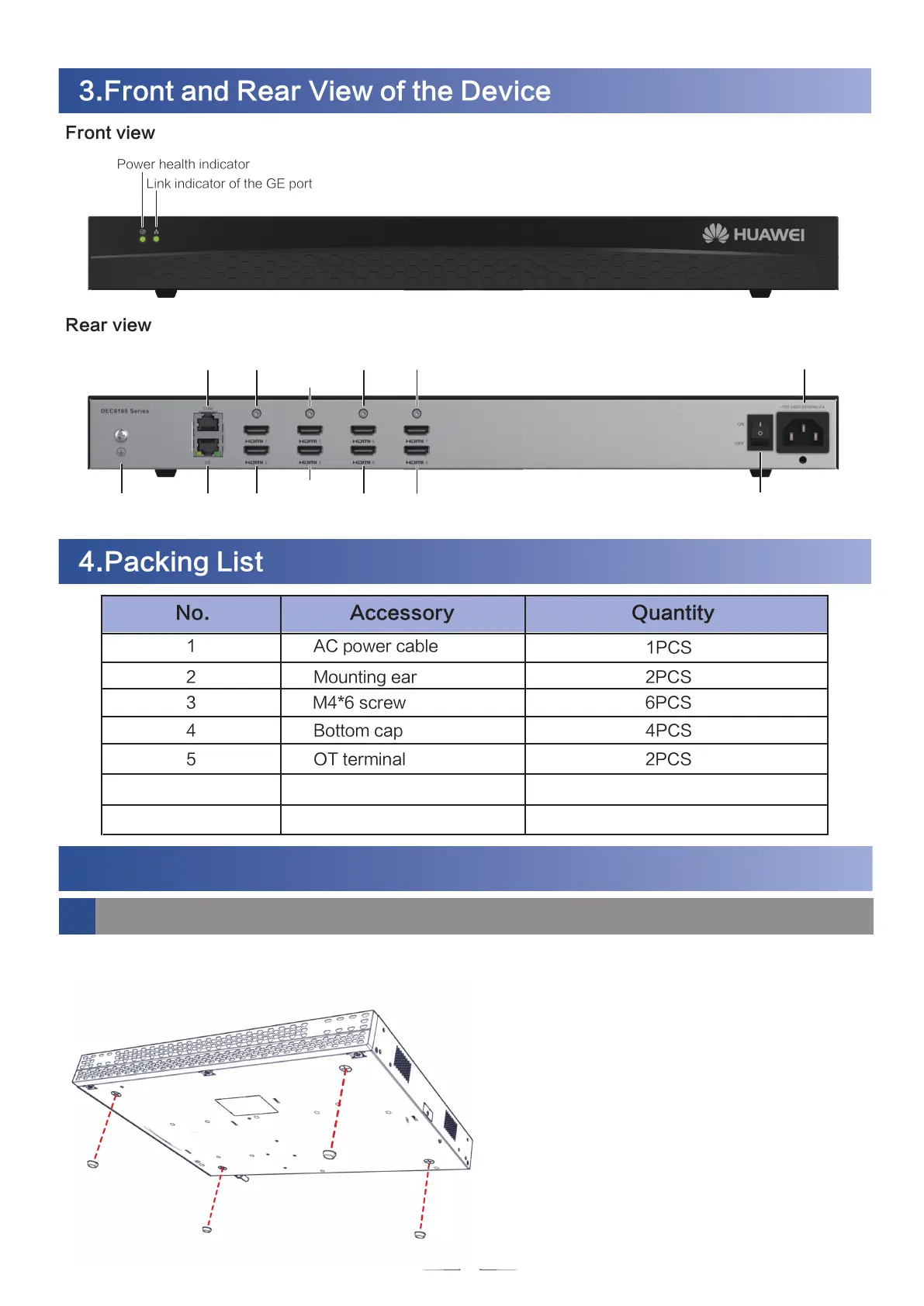 Huawei DEC6108 - Front and Rear View of the Device; Front View; Rear View; Packing List