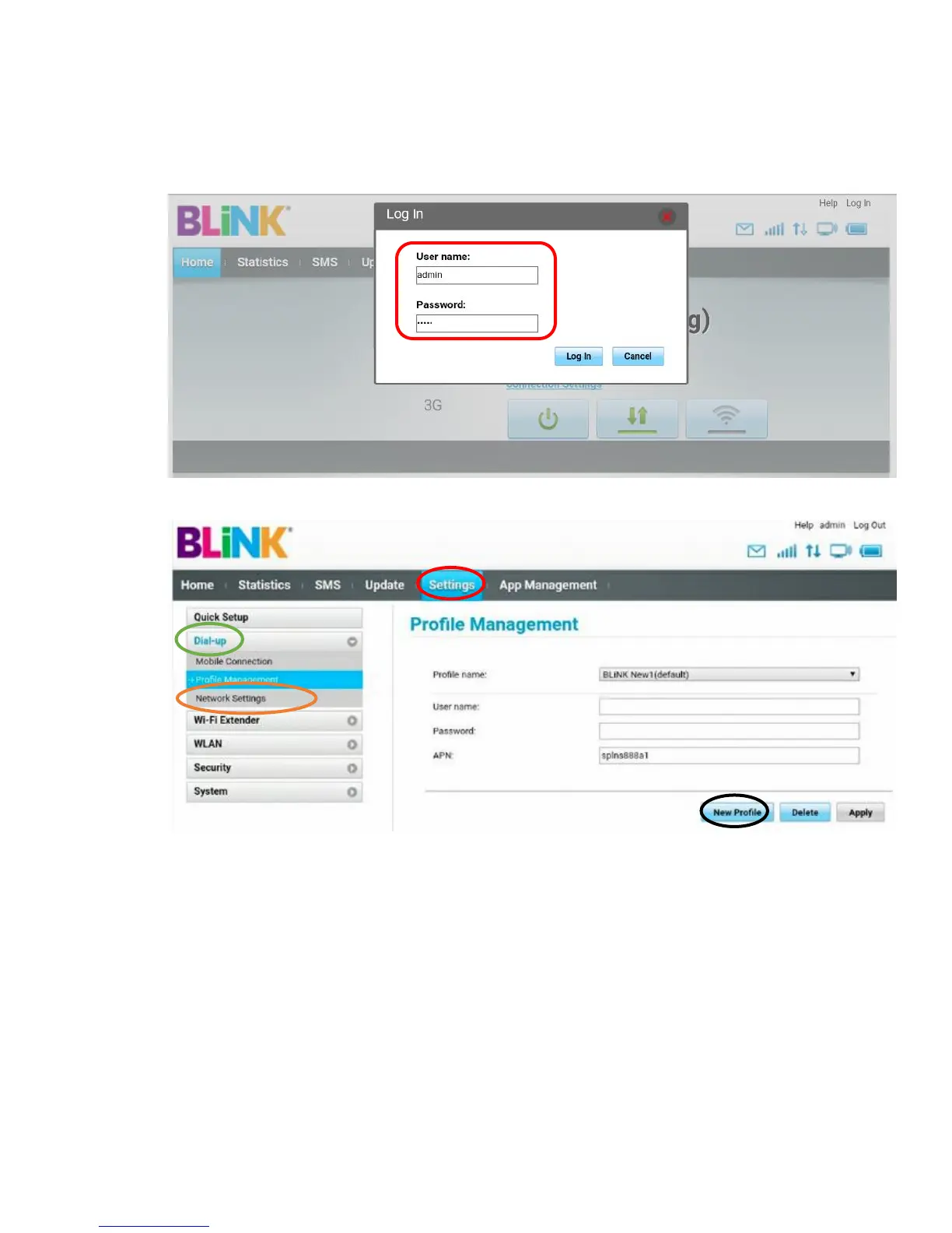 4. Click Settings and click Dial Up then Select Profile Management and click New profile