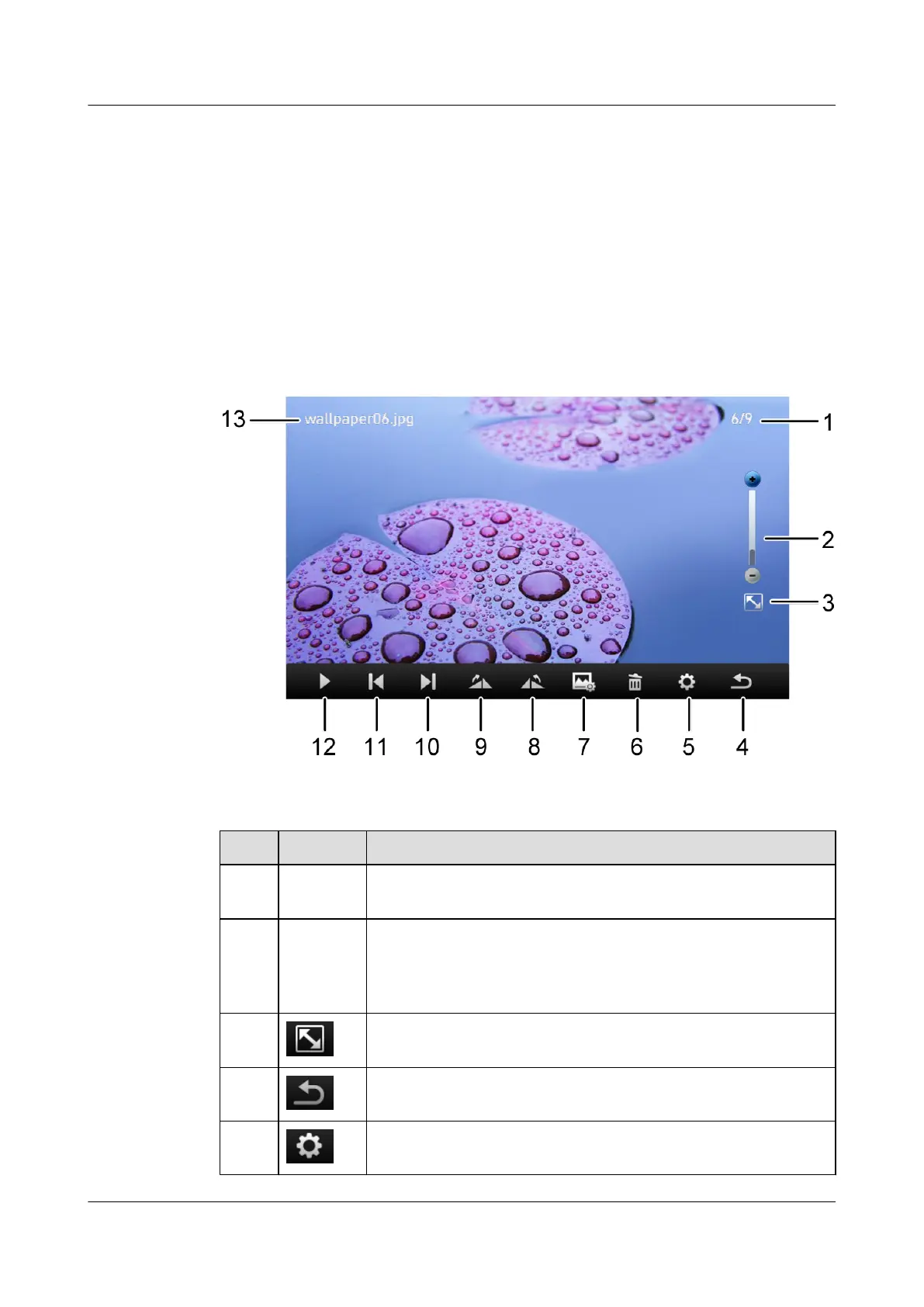 3 Display a picture in full screen mode. This icon functions only when