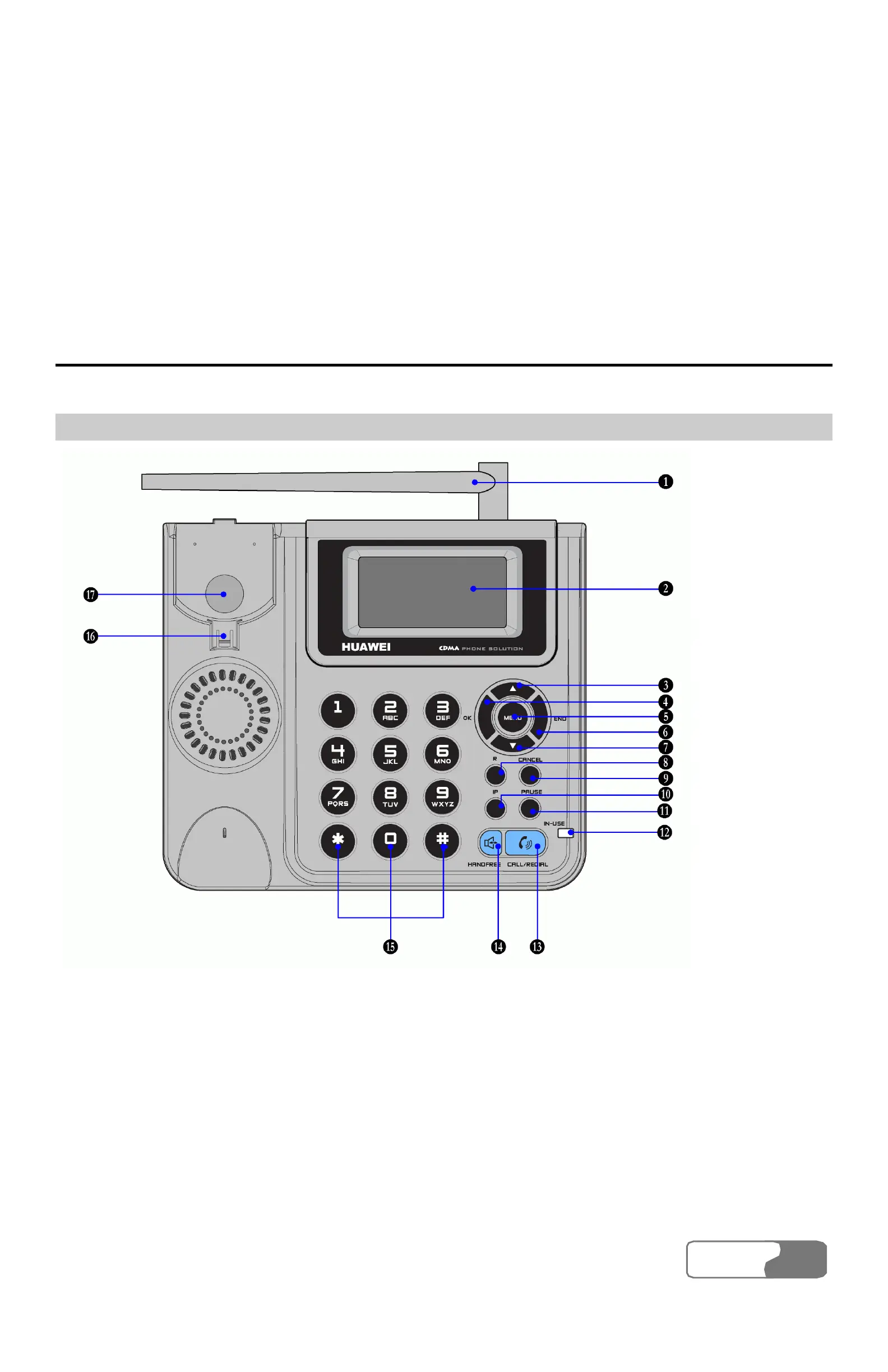 13) CALL/REDIAL key 14) HANDFREE key 15) Alphanumeric keys