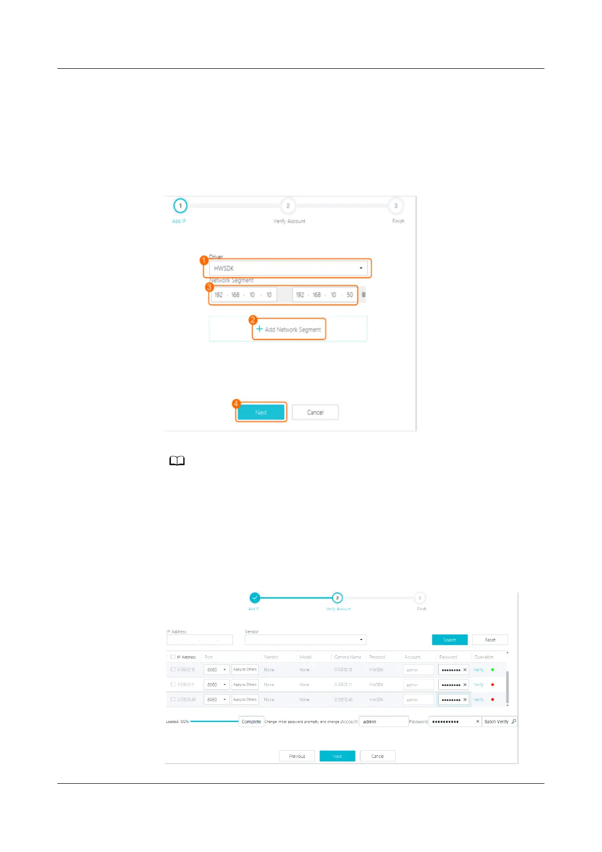 – The IP address segment indicates the start and end IP addresses of cameras.