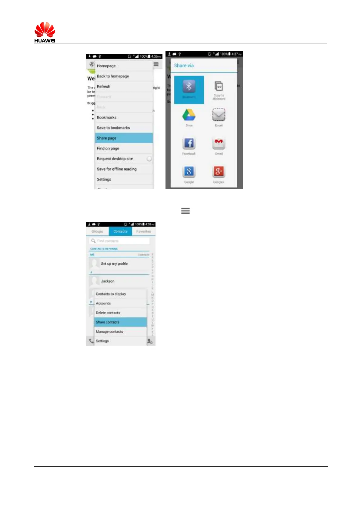 On the Contacts screen, touch > Share contacts > Bluetooth.