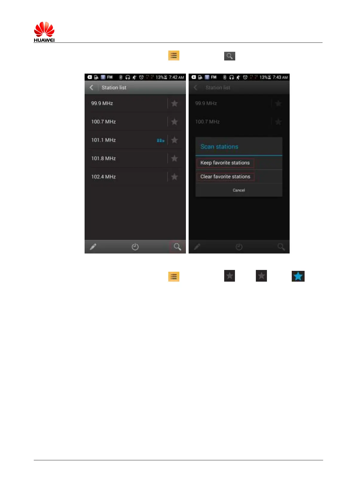 On the FM Radio screen, touch > Station list > . When turns to , the