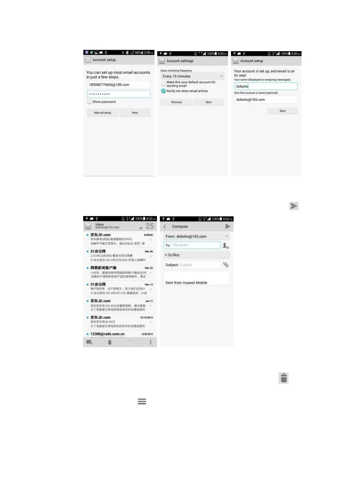 On the Inbox screen, select and view an email. To delete an email, touch .