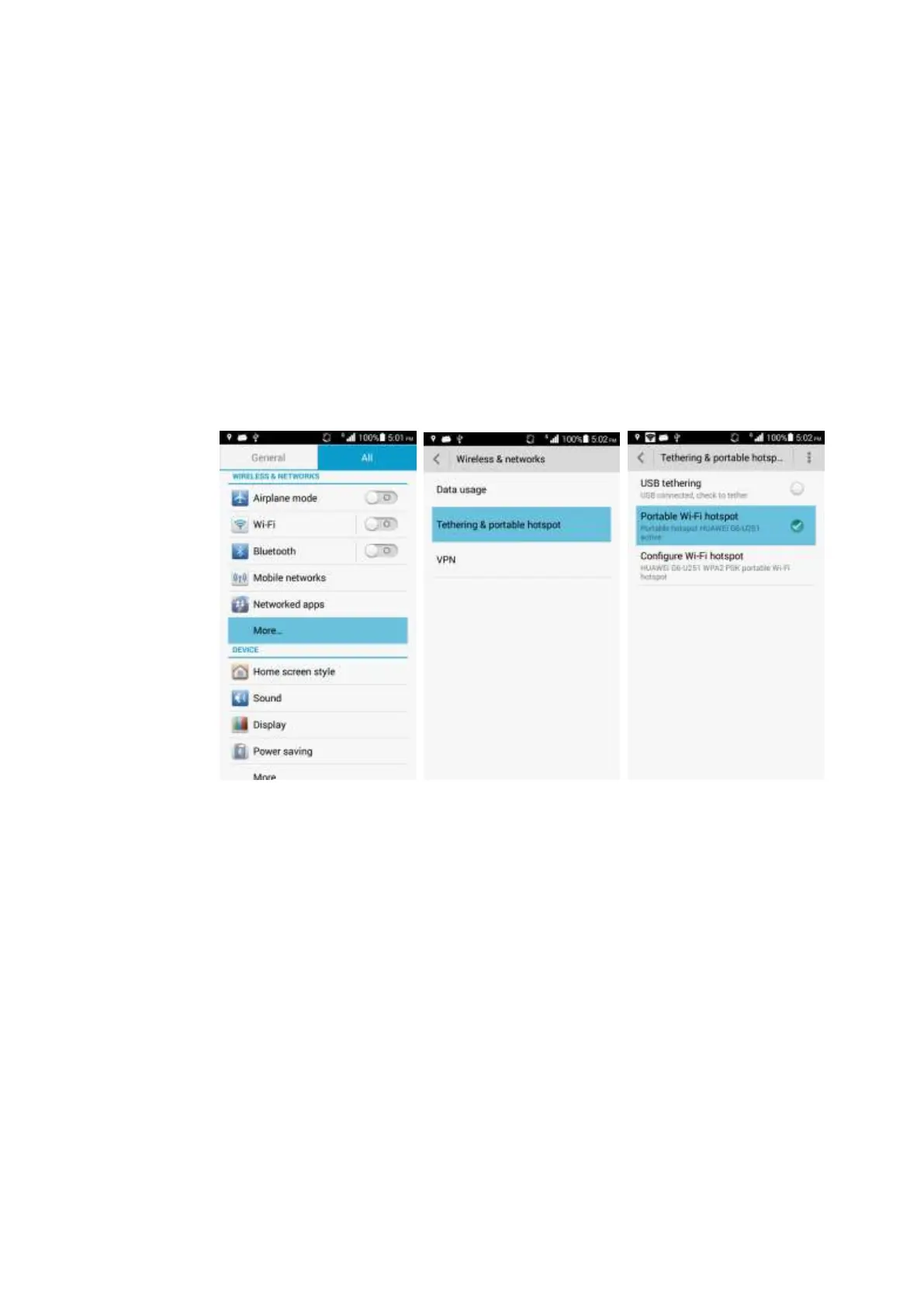 To enable this function, touch Settings > More... > Tethering & portable hotspot >