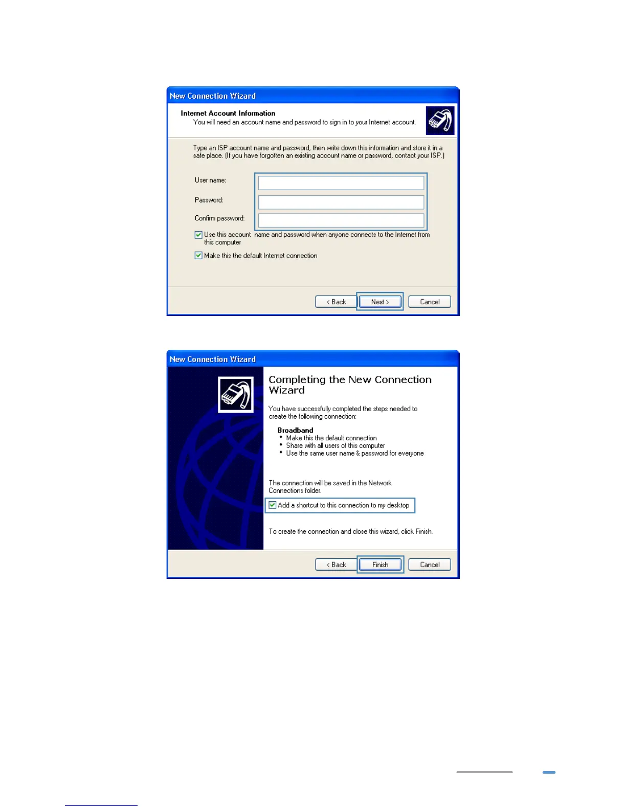 9. Enter the dial-up connection account name and password provided by your ISP and click