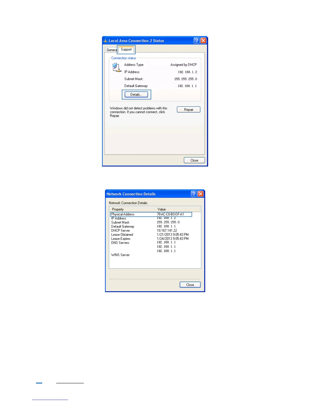 3. In Network Connection Details, find the line similar to Physical Address 78–AC–C0–B0–