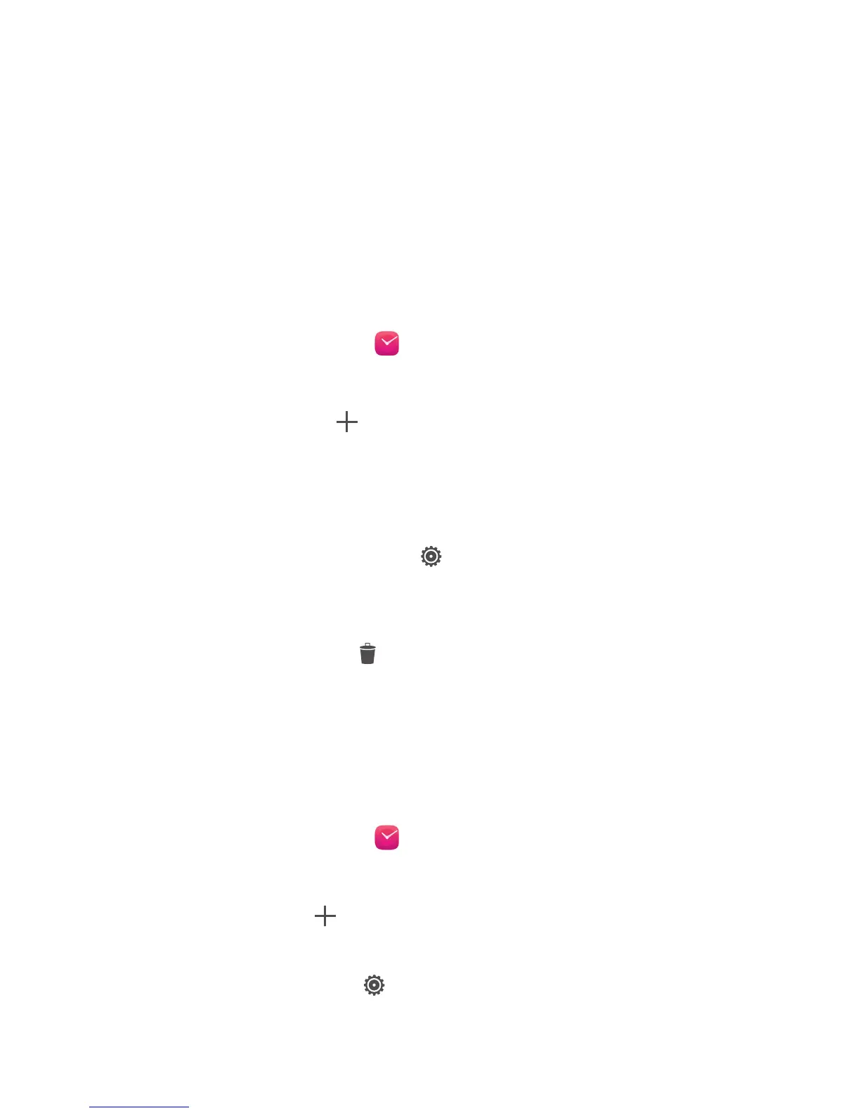Add an alarm: Touch , and set the alarm time, ringtone, how often it