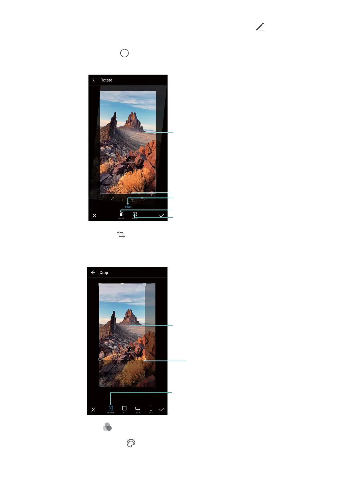 l Crop an image : Touch to select the crop ratio . Drag the dotted edges to crop the