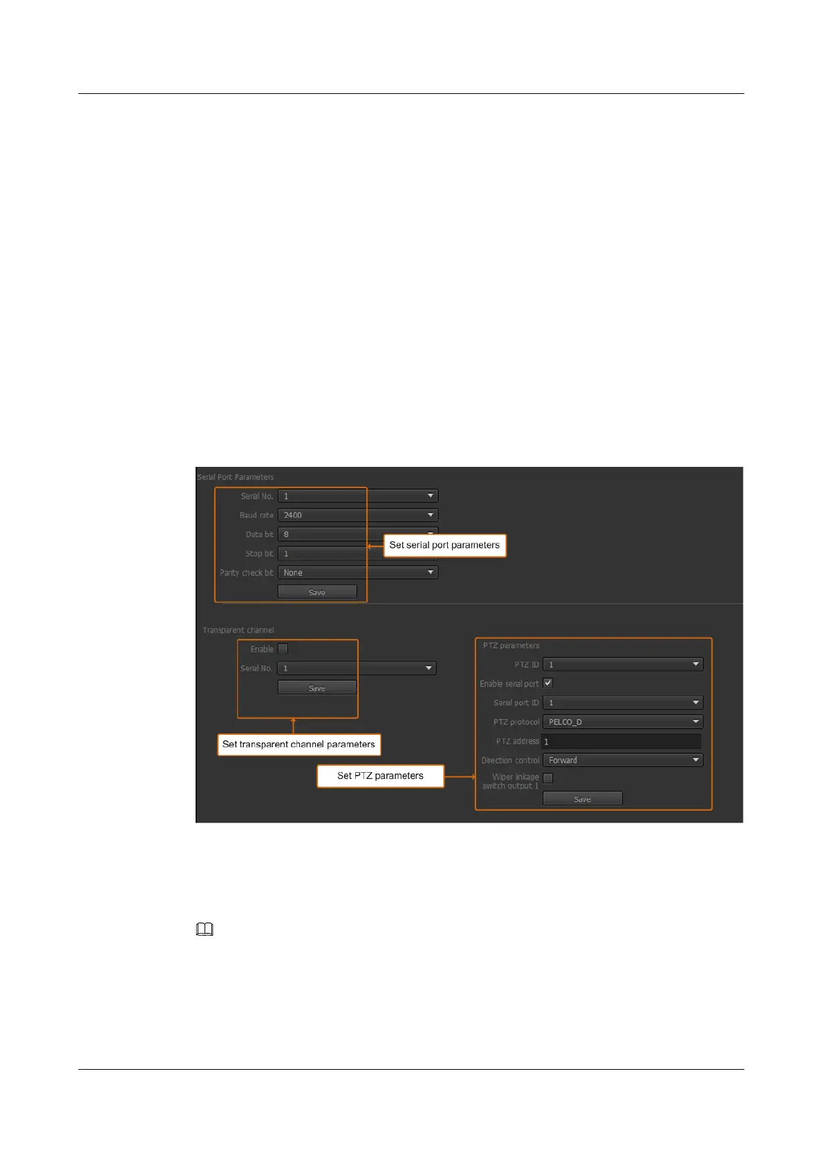 l The Enable in the transparent channel and Enable serial port in the PTZ parameters area cannot be