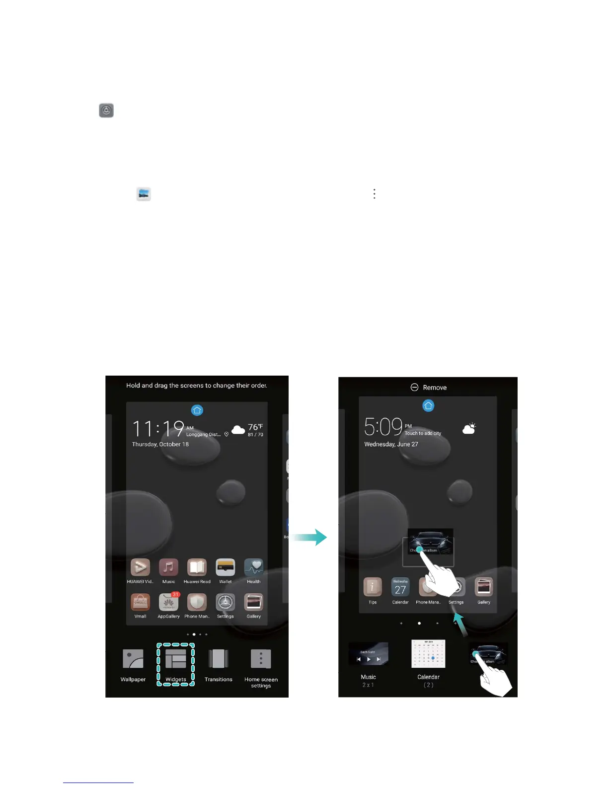 mode. Touch Widgets, touch and hold a widget and drag it to an empty area on the home screen, or