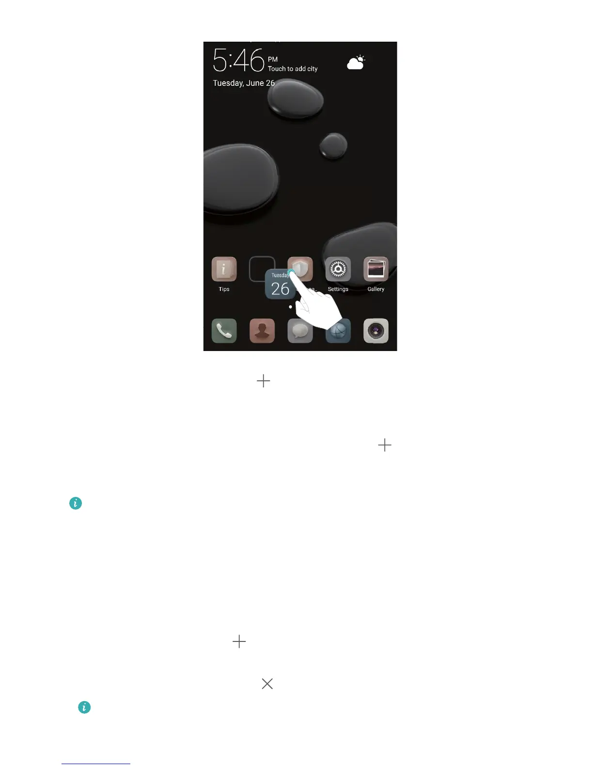 Touch and hold an empty area on the home screen to enter home screen editing mode. You can do