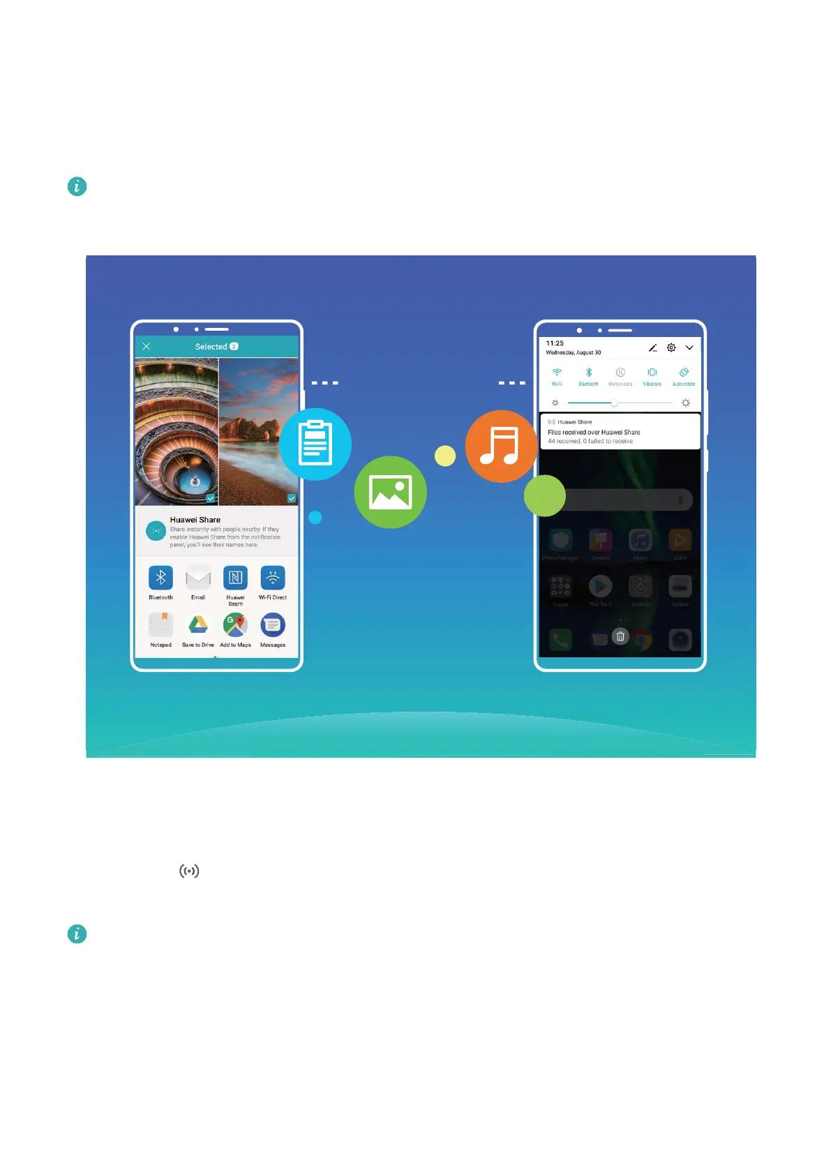 Huawei Share uses Wi-Fi and Bluetooth to transfer data. When Huawei Share is enabled, both Wi-