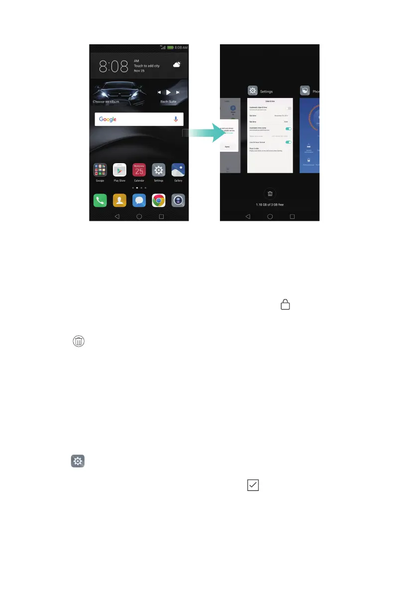 Swipe down on a thumbnail to lock the corresponding app. will appear next to the