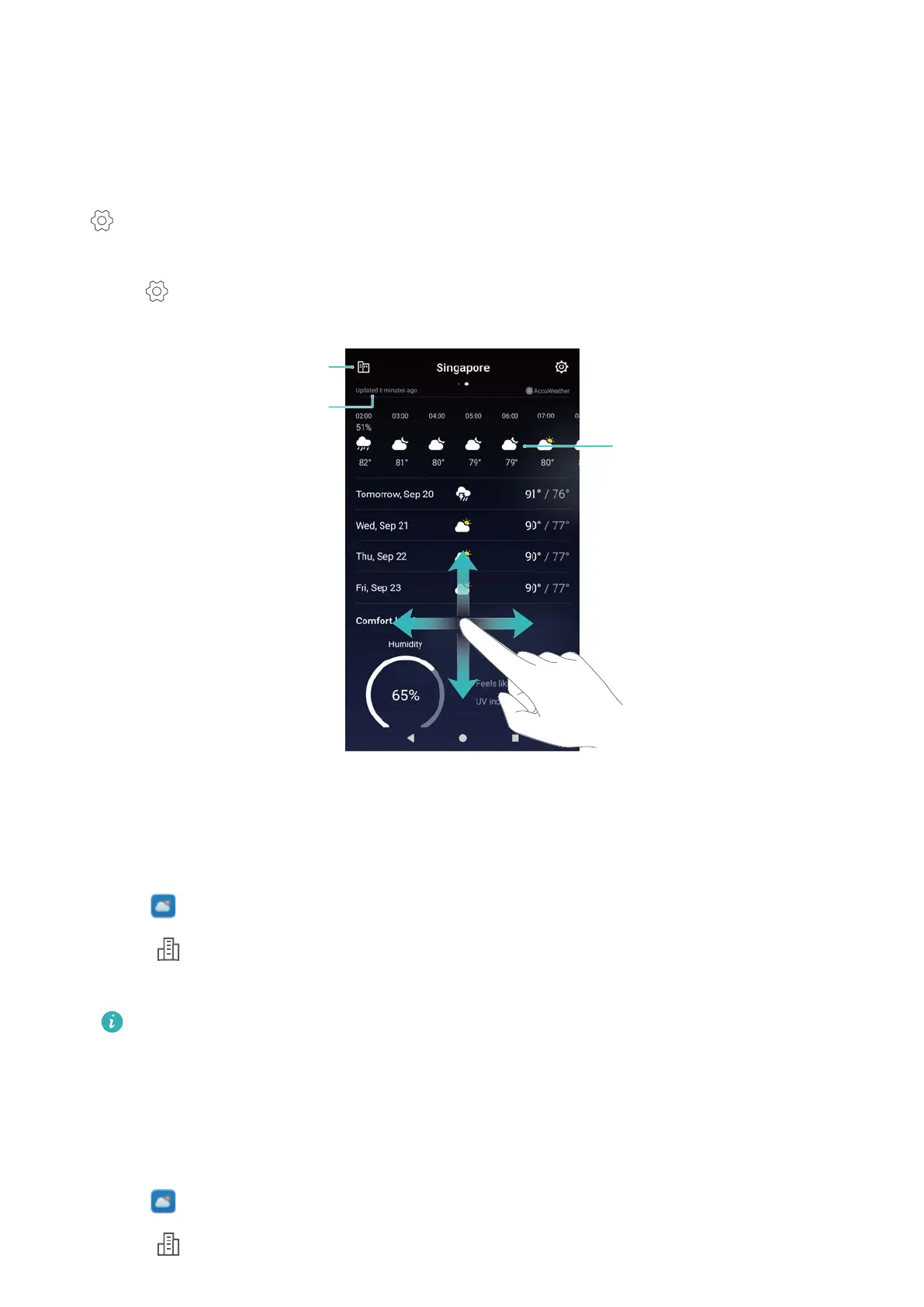 l View weather for other cities: Swipe left or right on the screen to view the weather forecast