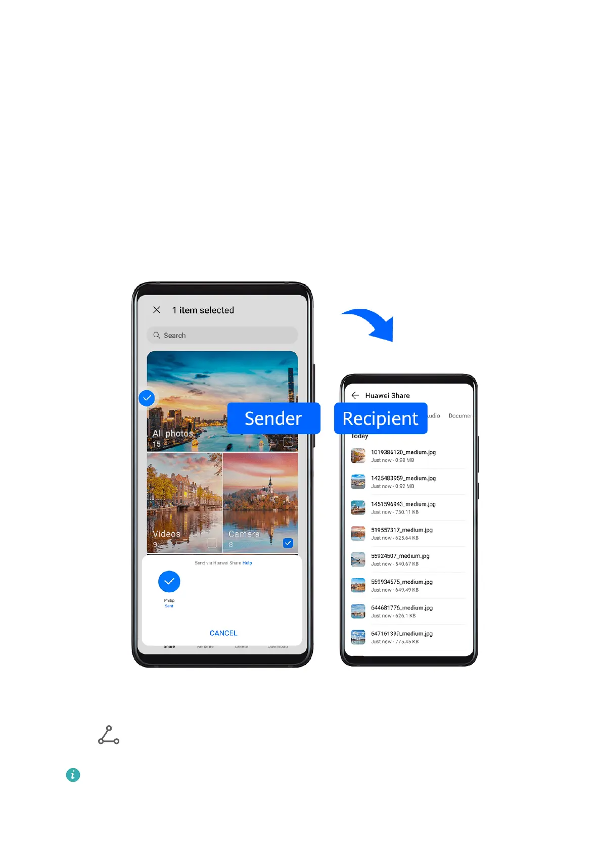 You can use Huawei Share to quickly share les between Huawei phones. The recipient can