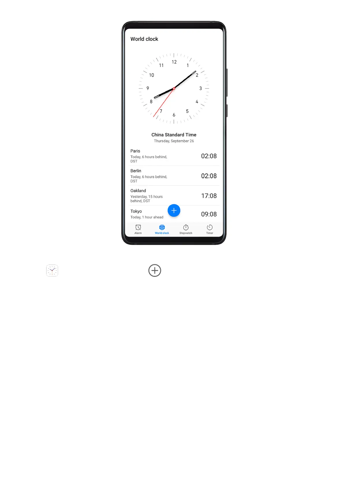 Clock > World clock, touch , and enter the name of a city or select one from