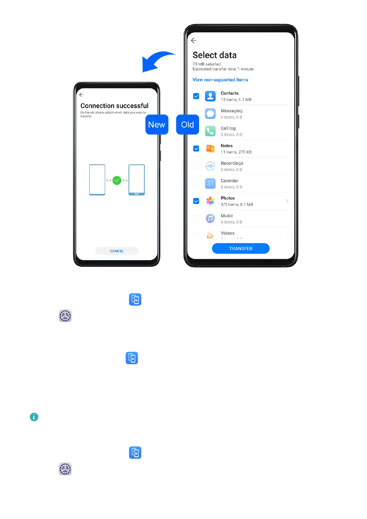 4 On your old device, select the data you want to clone, then touch Transfer to start