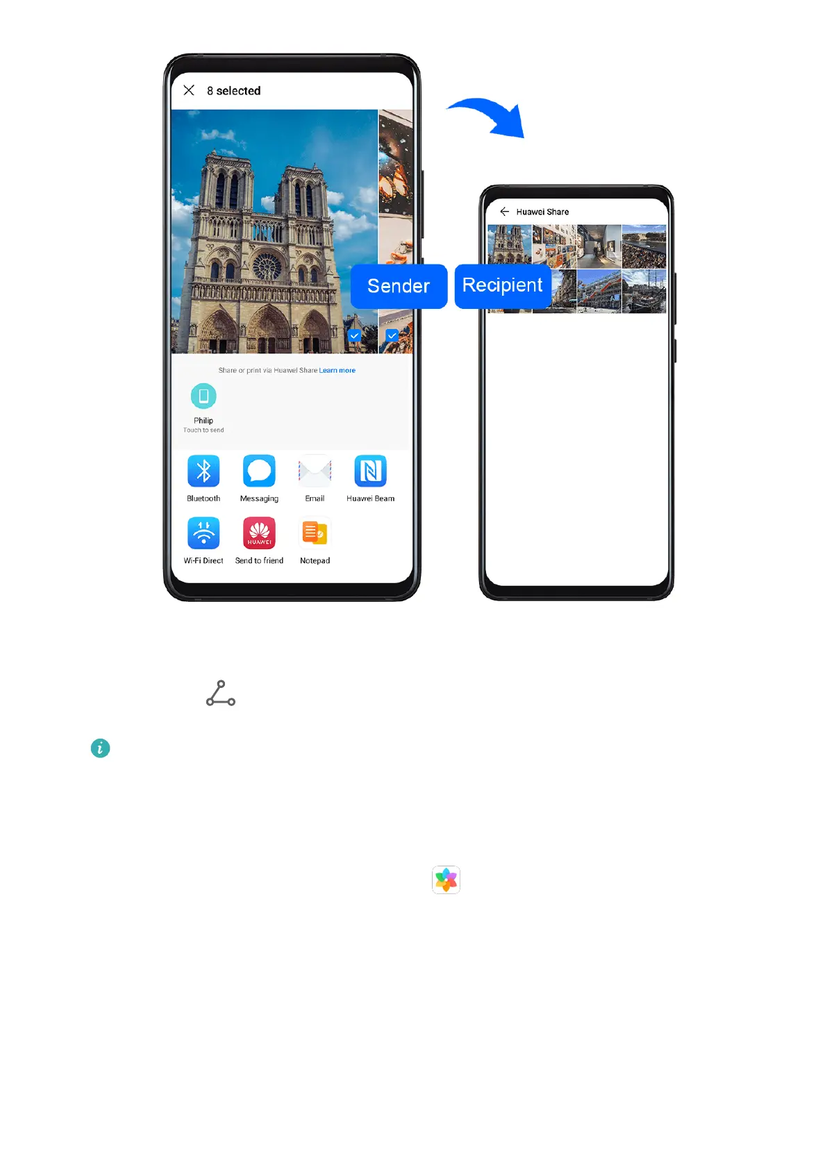 You can use Huawei Share to quickly and easily share les wirelessly between your phone