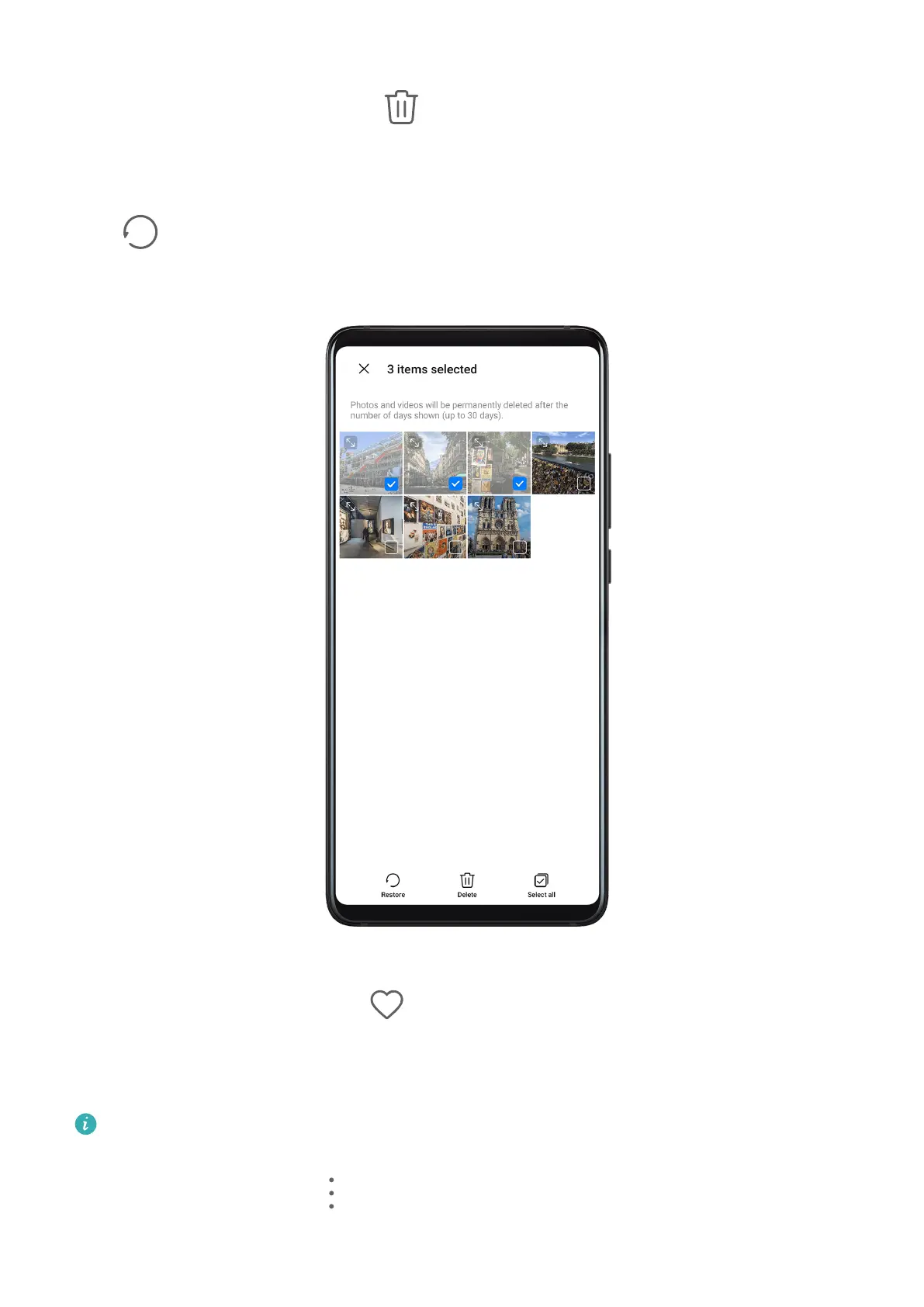 In the Recently deleted album, touch and hold to select the items you want to recover, then