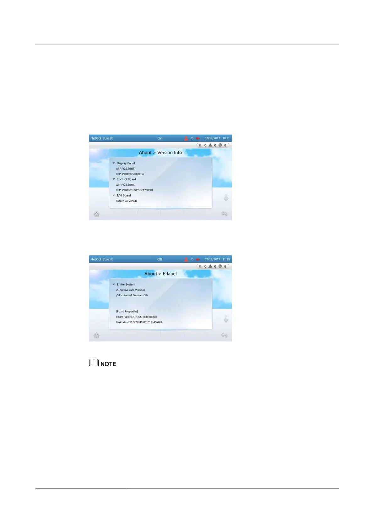 Step 2 On the About screen, tap Version Info or E-label. Figure 6-11 and Figure 6-12 are displayed.