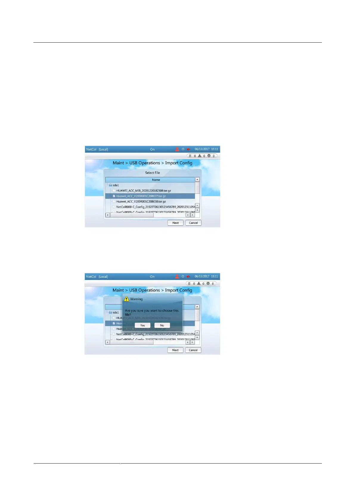 Step 1 Tap Maint > USB Operations > Import Config, as shown in Figure 6-31.
