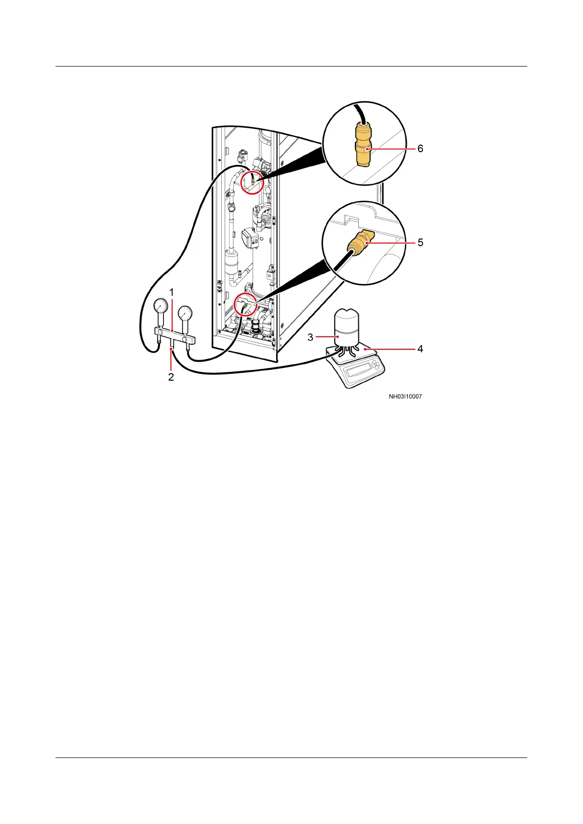 (1) Pressure gauge (2) Coupling nut (3) Refrigerant steel cylinder