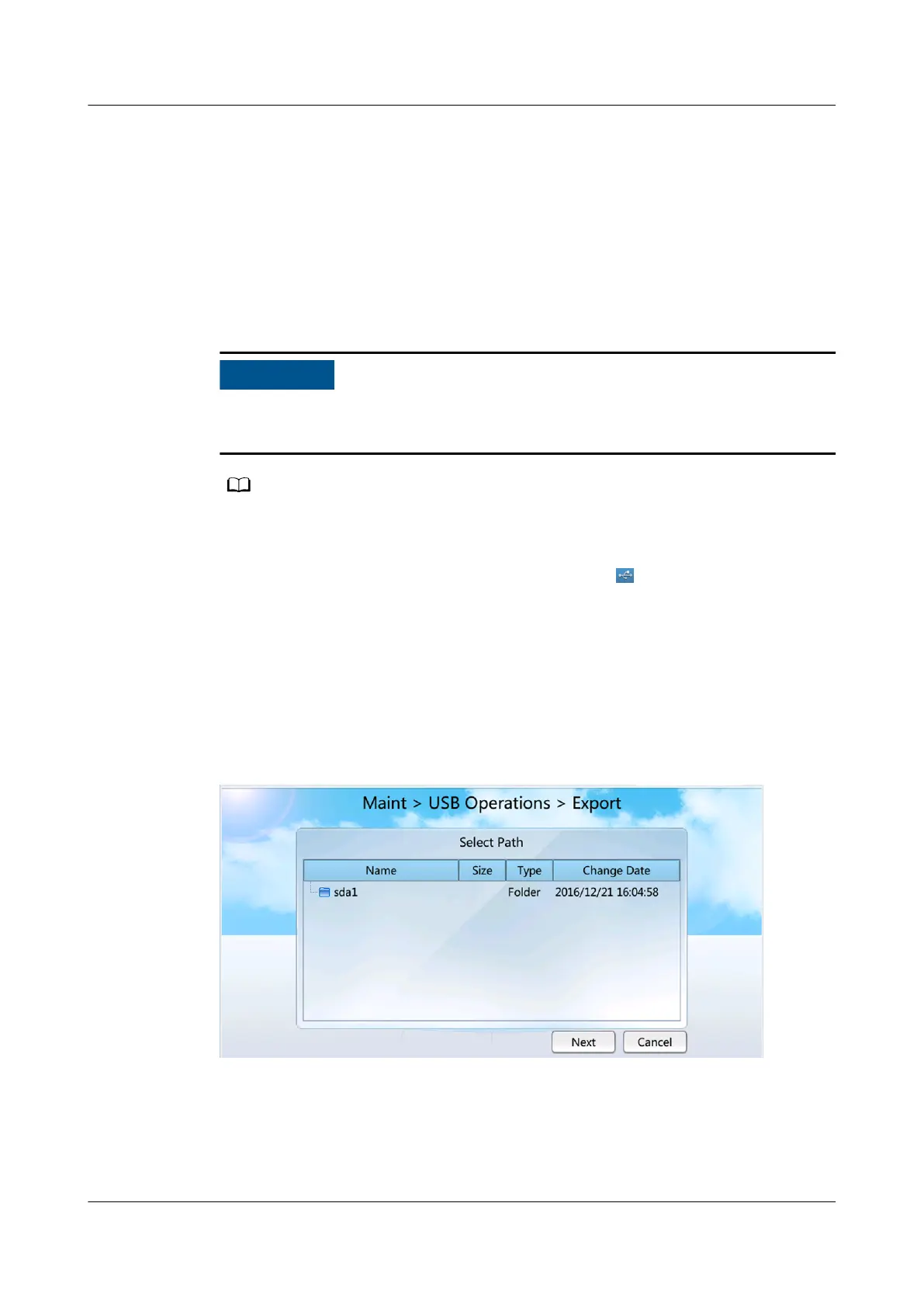 Step 1 Tap Maint > USB Operations > Export to enter the Select Path screen, as shown