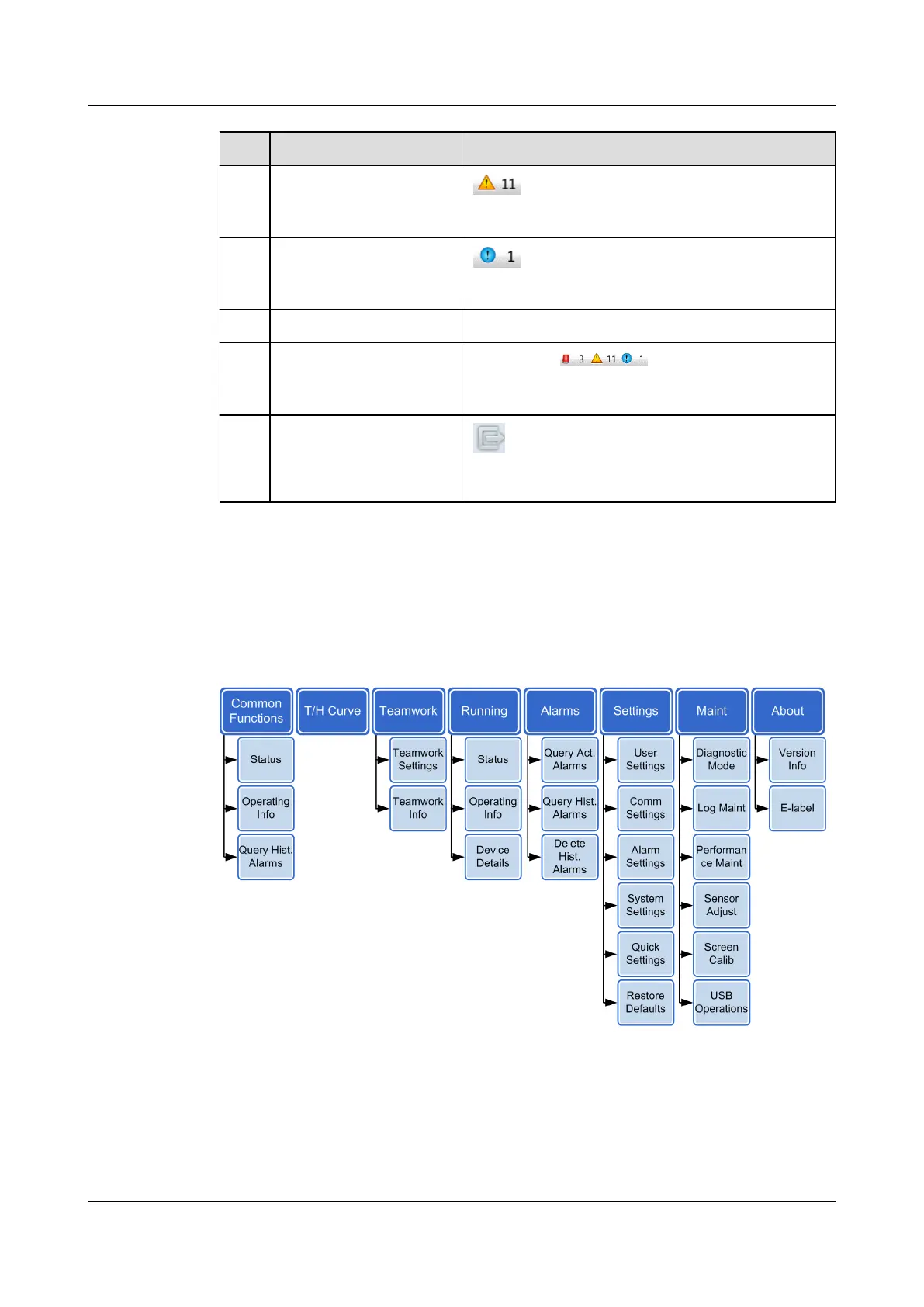 Indicates the component status, system parameters, and historical alarms of