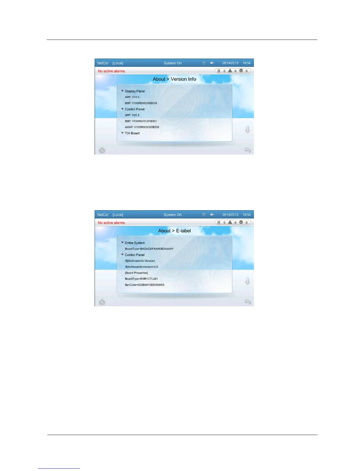 The E-Label screen displays electronic labels of the entire system, main control board, and