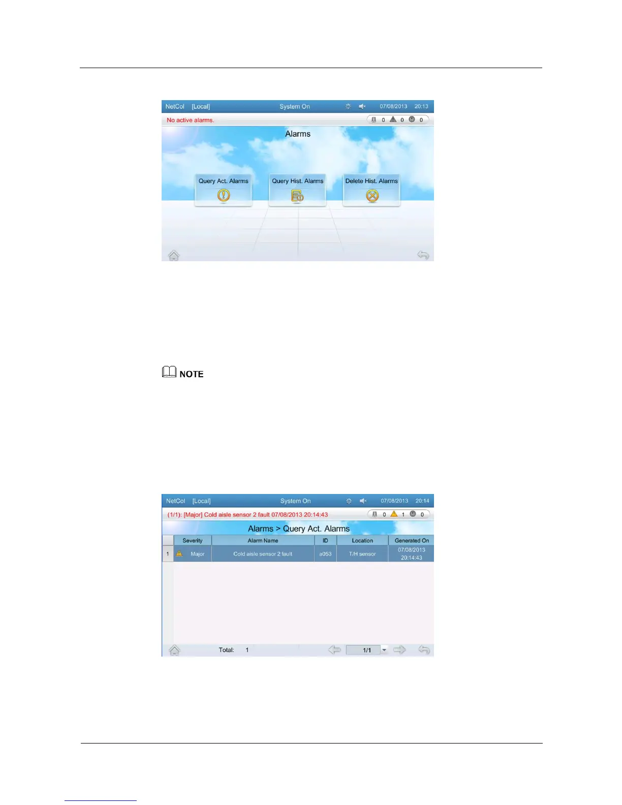 Tap Alarms > Query Act. Alarms on the home screen to enter the active alarms screen, as