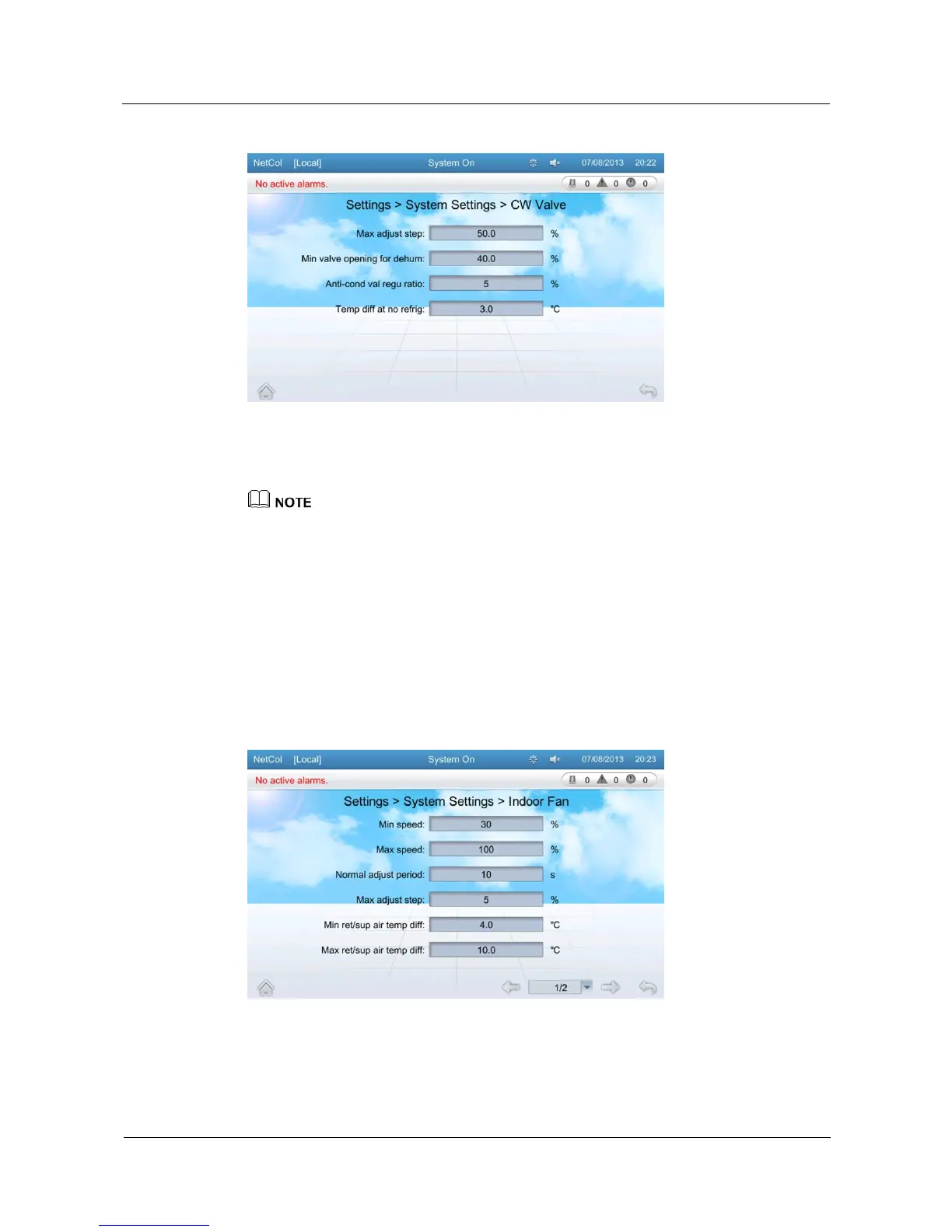 If you need to change CW valve settings, log in as the Admin user or other types of users that have