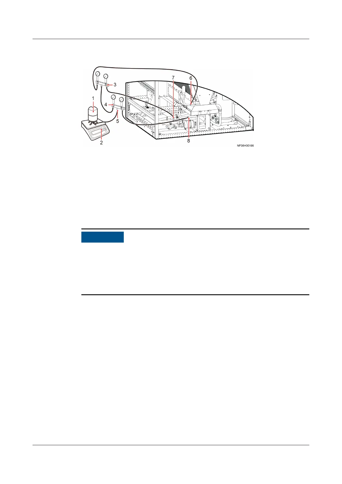 (1) Refrigerant cylinder (2) Electronic scale (3) Pressure gauge 1 (4) Pressure gauge 2
