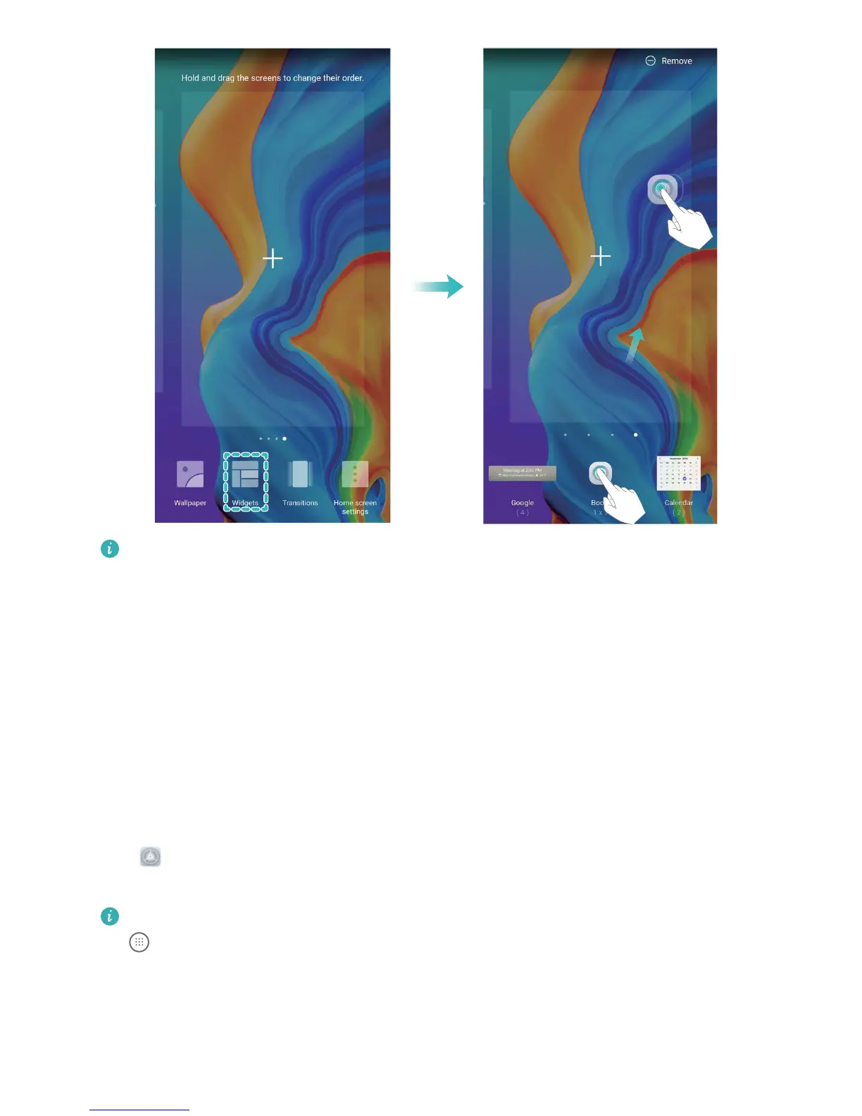 Move widgets: Touch and hold a widget on the home screen until your Phone vibrates. Drag the