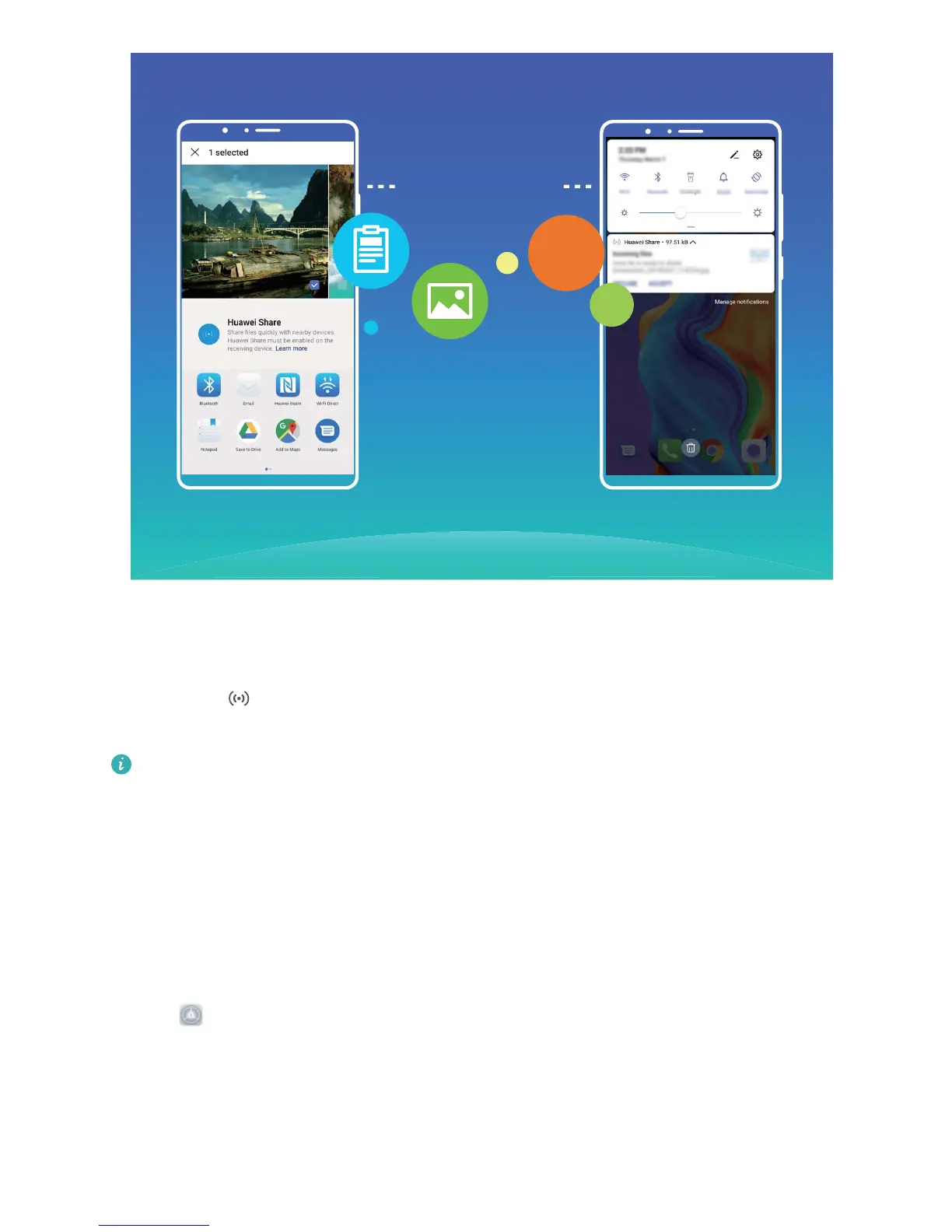 Use Huawei Share to receive les: Swipe down from the status bar to open the notication panel,