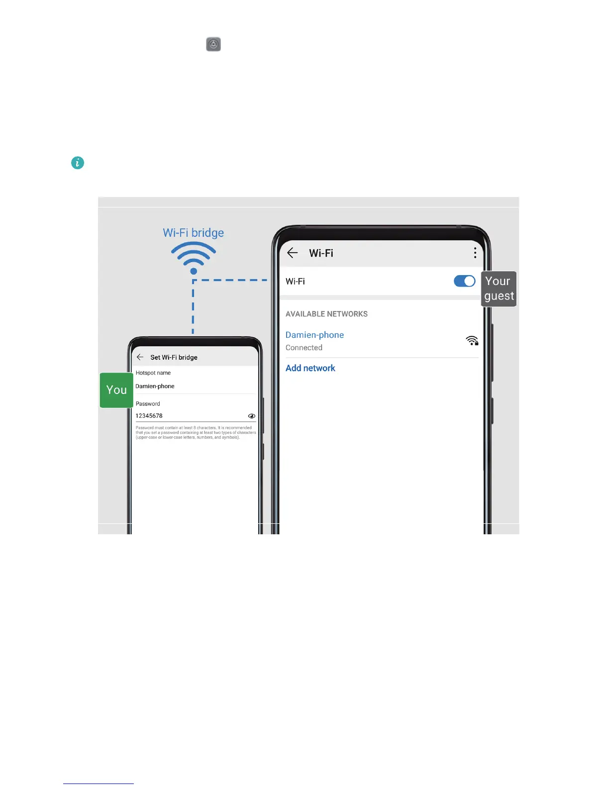 Set Wi-Fi bridge: Touch Set Wi-Fi bridge to view or set a temporary name and password for the