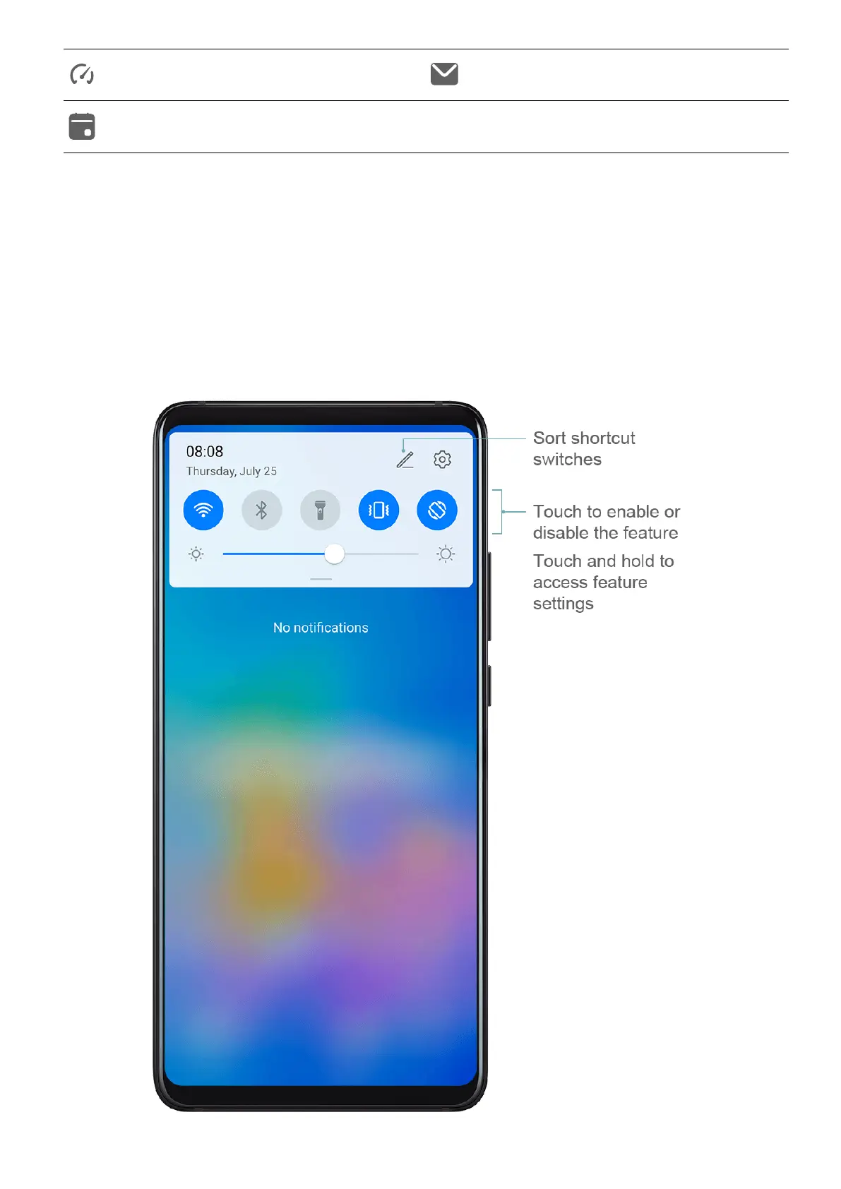 • Touch a shortcut switch to enable or disable the corresponding feature.