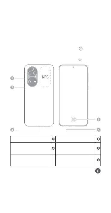 Huawei P50 - اللغة العربيةتعرف على جهازكقبل استخدام الجهاز، تعرّف على عملياته الأساسية.•لتشغيل جهازك، اضغط مع الاستمرار على زر التشغيل حتى تضيء الشاشة.•لإيقاف تشغيل جهازك، اضغط مع الاستمرار على زر التشغيل، ثم انقر على.•لبدء تشغيل جهازك، اضغط مع الاستمرار على زر التشغيل، ثم انقر على.زر الصوتزر التشغيلمنفذ USB من النوع C;مقبس سماعة رأسفتحة البطاقةقارئ بصمات الأصابع المُدمج في الشاشة •احمل جهازك بالقرب من جهاز أو جسم آخر حتى تتلامس مناطق اكتشاف NFC عند استخدام وظيفة NFC.البدء•كن حذرًا ألا تخدش جهازك أو تؤذي نفسك عند استخدام دبوس الإخراج.•احفظ دبوس الإخراج بعيدًا عن متناول الأطفال لمنع بلعه أو الإصابة عن غير قصد.•لا تستخدم بطاقات SIM معدلة أو بطاقات NM (بطاقات ذاكرة نانو) المقصوصة أو المعدلة مع جهازك حيث قد لا يتم التعرف عليها وقد تتسبب في تلف درج (فتحة) البطاقة.•إذا كانت بطاقة SIM غير مطابقة لجهازك، فيُرجى الاتصال بشركة الاتصالات الخاصة بك.اتبع التعليمات الموضحة في الأشكال التالية لإعداد جهازك. يُرجى استخدام دبوس الإخراج المرفق.تأكد من توافق البطاقة بشكل صحيح ومن إدخال نتوءها أولاً في درج البطاقة.بطاقة SIM فردية:بطاقتي SIM:إدارة بطاقة SIMحدد بطاقة بيانات الجوال الافتراضية وبطاقة الاتصال الافتراضية حسب الحاجة.•تعتمد خدمة الجيل الرابع على دعم شركة الاتصالات الخاصة بالشبكة ونشرها للخدمات ذات الصلة. يُرجى الاتصال بشركة الاتصالات لتنشيط خدمة الجيل الرابع.•قد لا تتوفر خدمة الجيل الرابع في مناطق معينة بسبب تداخل الشبكة.•إذا كان هذا الدليل متعارضًا مع الوصف الموجود على موقع الويب الرسمي، فيتم ترجيح الأخير.للمزيد من المعلوماتإذا واجهتك أي مشكلات أثناء استخدام جهازك، فيمكنك الحصول على المساعدة من الموارد التالية:•تفضل بزيارة https:;;consumer.huawei.com;en لعرض معلومات الجهاز والأسئلة الشائعة ومعلومات أخرى.•تفضل بزيارة https:;;consumer.huawei.com;en;support للحصول على أحدث معلومات الاتصال الخاصة ببلدك أو منطقتك.•انتقل إلى الإعدادات وأدخل الكلمات الرئيسية التالية في خانة البحث لعرض المعلومات المقابلة. على سبيل المثال المعلومات القانونية، ومعلومات السلامة، ومعلومات المصادقة، وشعارات التصديق.معلومات السلامةيُرجى قراءة كافة معلومات السلامة بعناية قبل استخدام الجهاز لضمان تشغيله بشكل آمن وسليم، ولمعرفة كيفية التخلص من جهازك بشكل صحيح.التشغيل والسلامة• لتجنب احتمالية الإضرار بحاسة السمع، يُرجى عدم الاستماع إلى مستوى صوت عالي لمدة طويلة.•استخدام محول طاقة أو شاحن أو بطارية غير معتمدة أو غير متوافقة قد يؤدي إلى تلف الجهاز أو تقصير عمره الافتراضي أو التسبب في حدوث حريق أو انفجار أو غير ذلك من المخاطر.•درجة الحرارة المثالية للتشغيل بين 0 درجة مئوية و35 درجة مئوية. ودرجة الحرارة المثالية للتخزين ما بين -20 درجة مئوية و+45 درجة مئوية.•توصي الشركات المصنِّعة لمنظم ضربات القلب بأن تكون هناك مسافة لا تقل عن 15 سم بين الجهاز ومنظم ضربات القلب لمنع التداخل المحتمل مع منظم ضربات القلب. إذا كنت تستخدم جهاز منظم ضربات القلب، فضع الجهاز في الجانب المقابل لمنظم ضربات القلب ولا تحمل الجهاز في جيبك الأمامي.•احتفظ بالجهاز والبطارية بعيداً عن الحرارة وأشعة الشمس المباشرة المفرطة. وتجنب وضعهما على أو في أجهزة التسخين، كأفران الميكرويف، والمواقد، أو أجهزة الإشعاع.•التزم بالقوانين واللوائح المحلية أثناء استخدام الجهاز. للحد من مخاطر ارتكاب الحوادث، لا تستخدم الجهاز اللاسلكي أثناء القيادة.•استخدم الهاتف أثناء الطيران أو قبل الصعود للطائرة وفقًا للتعليمات المقدمة فقط. فقد يؤدي استخدام الأجهزة اللاسلكية على متن الطائرة إلى تشويش شبكات الاتصال اللاسلكية الخاصة بها، والتسبب في حدوث أخطار على عمليات تشغيل الطائرة، او اعتباره عملًا غير قانوني.•لتجنُّب تلف الدائرة الداخلية للجهاز أو الشاحن؛ لا تستخدم الجهاز في 